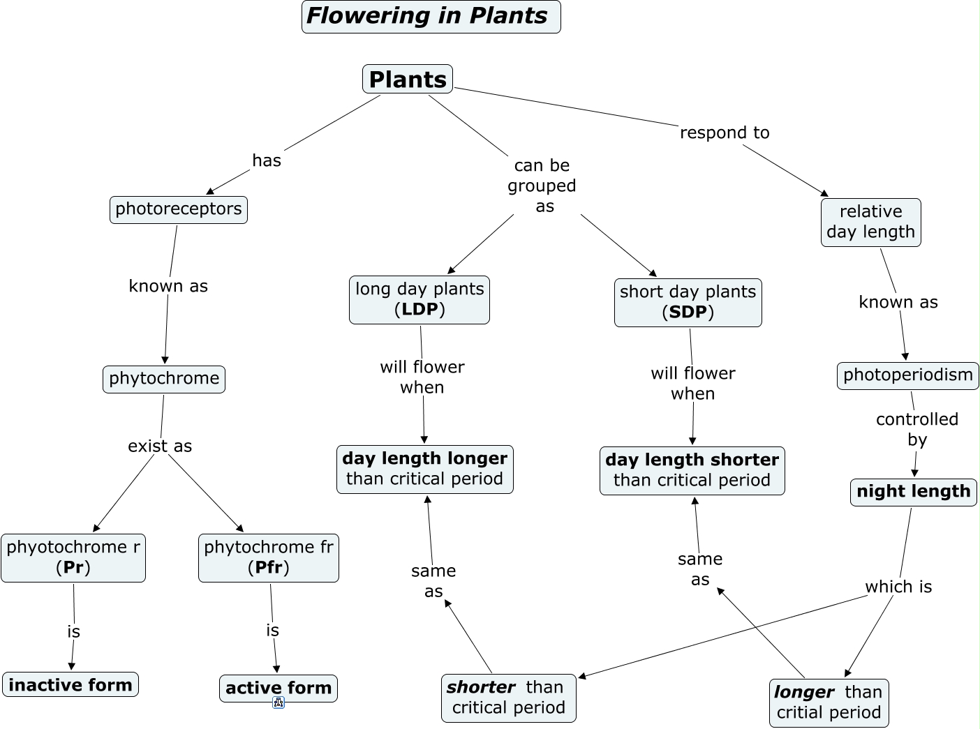 This Concept Map, created with IHMC CmapTools, has information related to: Plants, phyotochrome r (Pr) is inactive form, phytochrome fr (Pfr) is active form, long day plants (LDP) will flower when day length longer than critical period, phytochrome exist as phyotochrome r (Pr), photoreceptors known as phytochrome, short day plants (SDP) will flower when day length shorter than critical period, longer than critial period same as day length shorter than critical period, Plants can be grouped as long day plants (LDP), phytochrome exist as phytochrome fr (Pfr), photoperiodism controlled by night length, Plants respond to relative day length, Plants has photoreceptors, Plants can be grouped as short day plants (SDP), relative day length known as photoperiodism, shorter than critical period same as day length longer than critical period, night length which is shorter than critical period, night length which is longer than critial period