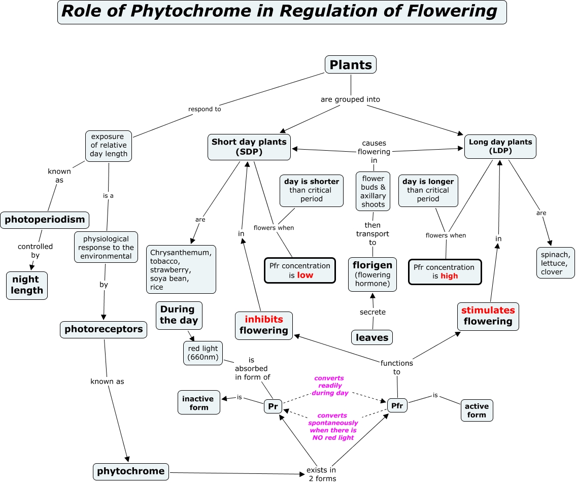 This Concept Map, created with IHMC CmapTools, has information related to: Regulation of flowering in plants edited, leaves secrete florigen (flowering hormone), Pr converts readily during day Pfr, Plants are grouped into Short day plants (SDP), phytochrome exists in 2 forms Pr, inhibits flowering in Short day plants (SDP), flower buds & axillary shoots causes flowering in Short day plants (SDP), Pfr is active form, Short day plants (SDP) are Chrysanthemum, tobacco, strawberry, soya bean, rice, florigen (flowering hormone) then transport to flower buds & axillary shoots, Long day plants (LDP) flowers when day is longer than critical period, Short day plants (SDP) flowers when Pfr concentration is low, During the day ???? red light (660nm), Pfr functions to inhibits flowering, Plants respond to exposure of relative day length, Long day plants (LDP) are spinach, lettuce, clover, physiological response to the environmental is a exposure of relative day length, flower buds & axillary shoots causes flowering in Long day plants (LDP), Pfr converts spontaneously when there is NO red light Pr, stimulates flowering in Long day plants (LDP), red light (660nm) is absorbed in form of Pr