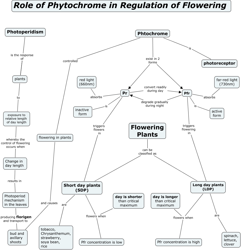 This Concept Map, created with IHMC CmapTools, has information related to: Regulation of flowering in plants, Pr triggers flowers in Short day plants (SDP), Short day plants (SDP) are tobacco, Chrysanthemum, strawberry, soya bean, rice, Phtochrome is photoreceptor, Phtochrome exist in 2 forms Pfr, Photoperidism is the response of plants, Pr convert readily during day Pfr, Long day plants (LDP) flowers when Pfr concentration is high, Pr is inactive form, Pfr absorbs far-red light (730nm), Flowering Plants can be classified as Long day plants (LDP), Pfr degrade gradually during night Pr, Phtochrome exist in 2 forms Pr, Photoperidism is the response of plants, Change in day length results in Photoperiod mechanism in the leaves, bud and axillary shoots and causes flowering in plants, plants to exposure to relative length of day length, Long day plants (LDP) flowers when day is longer than critical maximum, exposure to relative length of day length whereby the control of flowering occurs when Change in day length, Pfr is active form, Photoperiod mechanism in the leaves producing florigen and transport to bud and axillary shoots