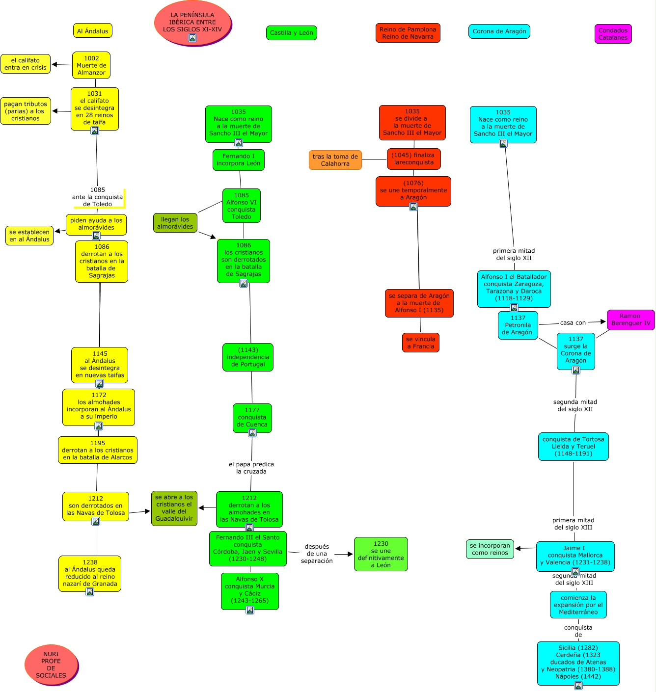 Este Cmap, tiene información relacionada con: PENÍNSULA IBÉRICA SIGLOS XI-XIV, 1085 Alfonso VI conquista Toledo ???? llegan los almorávides, conquista de Tortosa Lleida y Teruel (1148-1191) primera mitad del siglo XIII Jaime I conquista Mallorca y Valencia (1231-1238), 1035 se divide a la muerte de Sancho III el Mayor ???? (1076) se une temporalmente a Aragón, Alfonso I el Batallador conquista Zaragoza, Tarazona y Daroca (1118-1129) ???? 1137 Petronila de Aragón, Jaime I conquista Mallorca y Valencia (1231-1238) ???? se incorporan como reinos, llegan los almorávides ???? 1086 los cristianos son derrotados en la batalla de Sagrajas, 1195 derrotan a los cristianos en la batalla de Alarcos ???? 1212 son derrotados en las Navas de Tolosa, Fernando III el Santo conquista Córdoba, Jaen y Sevilla (1230-1248) ???? Alfonso X conquista Murcia y Cádiz (1243-1265), (1045) finaliza lareconquista ???? tras la toma de Calahorra, 1137 surge la Corona de Aragón segunda mitad del siglo XII conquista de Tortosa Lleida y Teruel (1148-1191), Fernando III el Santo conquista Córdoba, Jaen y Sevilla (1230-1248) después de una separación 1230 se une definitivamente a León, 1085 Alfonso VI conquista Toledo ???? 1086 los cristianos son derrotados en la batalla de Sagrajas, 1212 derrotan a los almohades en las Navas de Tolosa ???? Fernando III el Santo conquista Córdoba, Jaen y Sevilla (1230-1248), 1002 Muerte de Almanzor ???? el califato entra en crisis, 1177 conquista de Cuenca el papa predica la cruzada 1212 derrotan a los almohades en las Navas de Tolosa, 1212 son derrotados en las Navas de Tolosa ???? se abre a los cristianos el valle del Guadalquivir, 1172 los almohades incorporan al Ándalus a su imperio ???? 1195 derrotan a los cristianos en la batalla de Alarcos, 1137 Petronila de Aragón ???? 1137 surge la Corona de Aragón, 1212 derrotan a los almohades en las Navas de Tolosa ???? se abre a los cristianos el valle del Guadalquivir, 1035 Nace como reino a la muerte de Sancho III el Mayor primera mitad del siglo XII Alfonso I el Batallador conquista Zaragoza, Tarazona y Daroca (1118-1129)