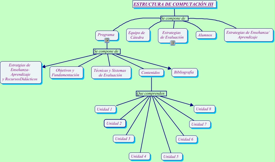 Este Cmap, tiene información relacionada con: Estructura de la materia, Contenidos Que comprenden Unidad 1, Contenidos Que comprenden Unidad 8, Programa Se compone de Estratgias de Enseñanza- Aprendizaje y RecursosDidácticos, Contenidos Que comprenden Unidad 5, Programa Se compone de Objetivos y Fundamentación, ESTRUCTURA DE COMPUTACIÓN III Se compone de Estrategias de Evaluación, Contenidos Que comprenden Unidad 3, ESTRUCTURA DE COMPUTACIÓN III Se compone de Estrategias de Enseñanza/ Aprendizaje, Programa Se compone de Técnicas y Sistemas de Evaluación, Programa Se compone de Bibliografía, ESTRUCTURA DE COMPUTACIÓN III Se compone de Programa, Contenidos Que comprenden Unidad 2, Contenidos Que comprenden Unidad 6, ESTRUCTURA DE COMPUTACIÓN III Se compone de Alumnos, ESTRUCTURA DE COMPUTACIÓN III Se compone de Equipo de Cátedra, Contenidos Que comprenden Unidad 4, Programa Se compone de Contenidos, Contenidos Que comprenden Unidad 7
