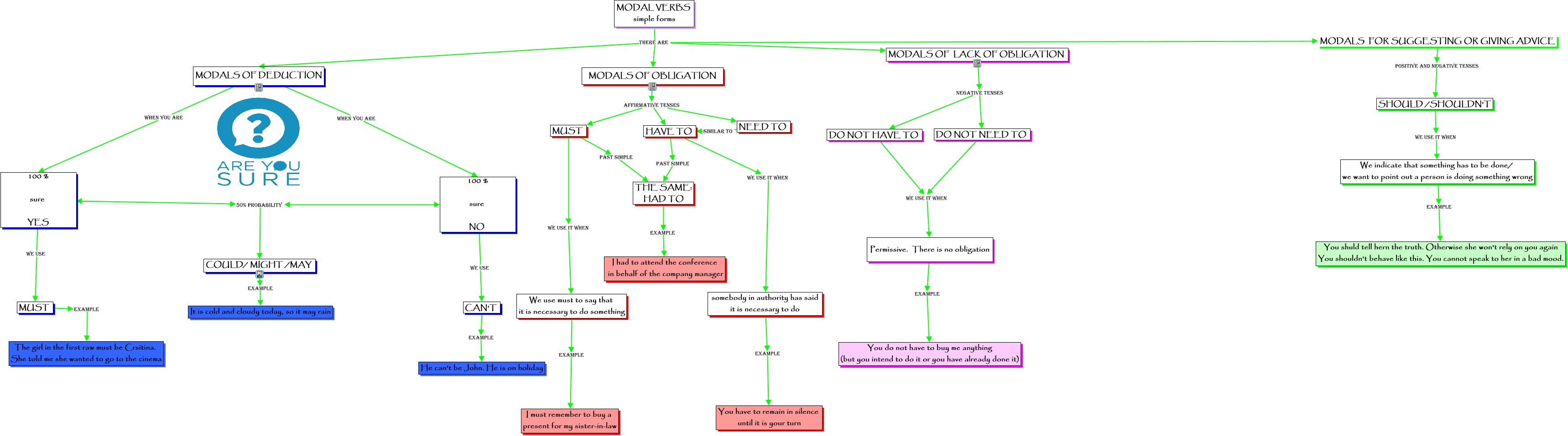Este Cmap, tiene información relacionada con: MODAL VERBS 3º ESO, MODALS OF LACK OF OBLIGATION NEGATIVE TENSES DO NOT HAVE TO, MODALS OF OBLIGATION AFFIRMATIVE TENSES NEED TO, DO NOT NEED TO WE USE IT WHEN Permissive. There is no obligation, MODALS OF DEDUCTION when you are 100 % sure YES, HAVE TO WE USE IT WHEN somebody in authority has said it is necessary to do, HAVE TO PAST SIMPLE THE SAME: HAD TO, NEED TO SIMILAR TO HAVE TO, MODAL VERBS simple forms there are MODALS OF DEDUCTION, MODALS FOR SUGGESTING OR GIVING ADVICE positive and negative tenses SHOULD /SHOULDN'T, DO NOT HAVE TO WE USE IT WHEN Permissive. There is no obligation, Permissive. There is no obligation example You do not have to buy me anything (but you intend to do it or you have already done it), MUST EXAMPLE The girl in the first raw must be Crsitina. She told me she wanted to go to the cinema, CAN'T example He can't be John. He is on holiday, MODALS OF OBLIGATION AFFIRMATIVE TENSES HAVE TO, 100 % sure YES 50% probability 100 % sure NO, COULD/ MIGHT /MAY example It is cold and cloudy today, so it may rain, MUST WE USE IT WHEN We use must to say that it is necessary to do something, 100 % sure YES we use MUST, We indicate that something has to be done/ we want to point out a person is doing something wrong example You shuld tell hern the truth. Otherwise she won't rely on you again You shouldn't behave like this. You cannot speak to her in a bad mood., 100 % sure NO we use CAN'T