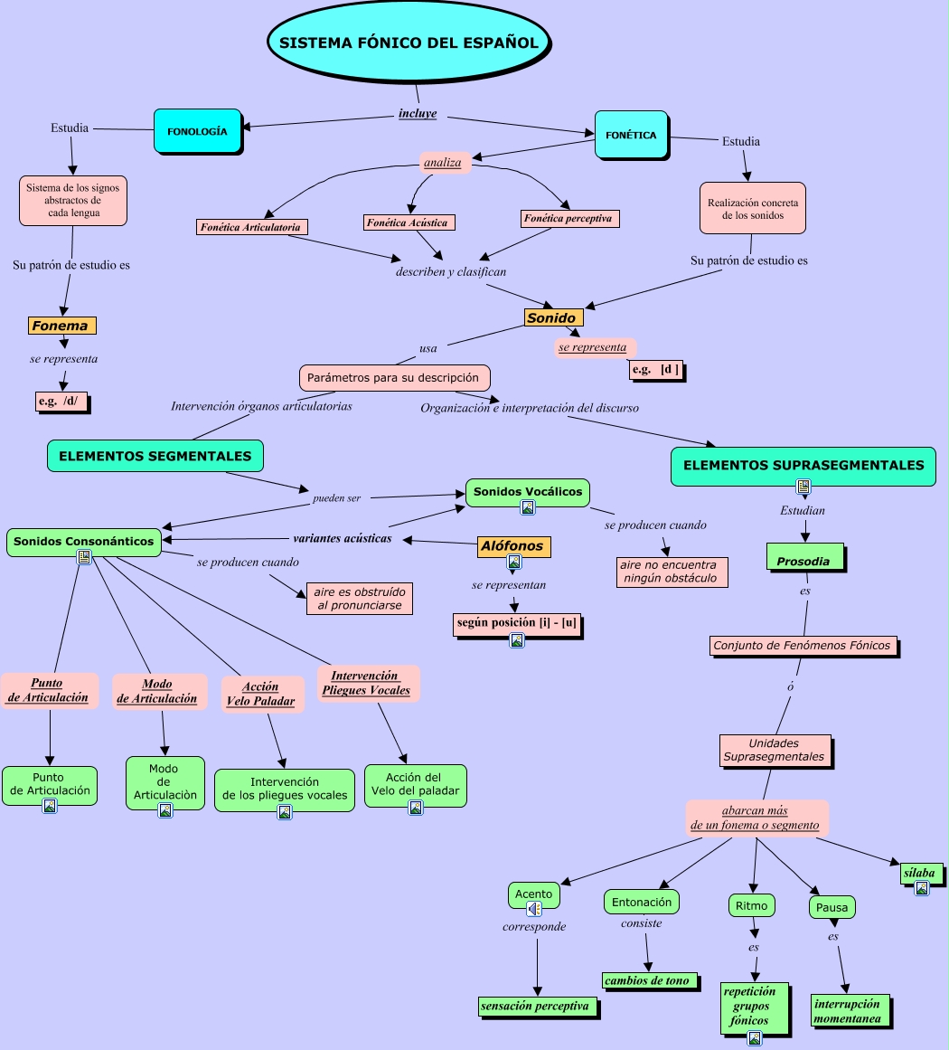 Este Cmap, tiene información relacionada con: Elementos Fónicos del Español, FONOLOGÍA Estudia Sistema de los signos abstractos de cada lengua, Ritmo es repetición grupos fónicos, Entonación consiste cambios de tono, Sistema de los signos abstractos de cada lengua Su patrón de estudio es Fonema, Fonema se representa e.g. /d/, Sonidos Consonánticos se producen cuando aire es obstruído al pronunciarse, Sonido se representa e.g. [d ], Prosodia es Conjunto de Fenómenos Fónicos, Conjunto de Fenómenos Fónicos ó Unidades Suprasegmentales, Unidades Suprasegmentales abarcan más de un fonema o segmento Entonación, Fonética perceptiva describen y clasifican Sonido, Alófonos se representan según posición [i] - [u], SISTEMA FÓNICO DEL ESPAÑOL incluye FONÉTICA, Sonidos Consonánticos Modo de Articulación Modo de Articulaciòn, Parámetros para su descripción Organización e interpretación del discurso ELEMENTOS SUPRASEGMENTALES, Fonética Articulatoria describen y clasifican Sonido, FONÉTICA Estudia Realización concreta de los sonidos, Sonidos Consonánticos Punto de Articulación Punto de Articulación, Unidades Suprasegmentales abarcan más de un fonema o segmento Ritmo, Parámetros para su descripción Intervención órganos articulatorias ELEMENTOS SEGMENTALES