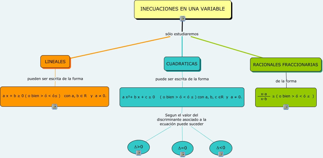 Este Cmap, tiene información relacionada con: Tipos de Inecuaciones, a x²+ b x + c ≥ 0 ( o bien > ó < ó ≤ ) con a, b, c ∈R y a ≠ 0. Segun el valor del discriminante asociado a la ecuación puede suceder Δ=0, INECUACIONES EN UNA VARIABLE sólo estudiaremos LINEALES, LINEALES pueden ser escrita de la forma a x + b ≥ 0 ( o bien > ó < ó≤ ) con a, b ∈ R y a ≠ 0., RACIONALES FRACCIONARIAS de la forma <math xmlns="http://www.w3.org/1998/Math/MathML"> <mrow> <mfrac> <mtext> x-a </mtext> <mtext> x-b </mtext> </mfrac> <mtext> ≥ ( o bien > ó < ó ≤ ) </mtext> </mrow> </math>, INECUACIONES EN UNA VARIABLE sólo estudiaremos CUADRATICAS, a x²+ b x + c ≥ 0 ( o bien > ó < ó ≤ ) con a, b, c ∈R y a ≠ 0. Segun el valor del discriminante asociado a la ecuación puede suceder Δɬ, a x²+ b x + c ≥ 0 ( o bien > ó < ó ≤ ) con a, b, c ∈R y a ≠ 0. Segun el valor del discriminante asociado a la ecuación puede suceder Δɘ, INECUACIONES EN UNA VARIABLE sólo estudiaremos RACIONALES FRACCIONARIAS, CUADRATICAS puede ser escrita de la forma a x²+ b x + c ≥ 0 ( o bien > ó < ó ≤ ) con a, b, c ∈R y a ≠ 0.