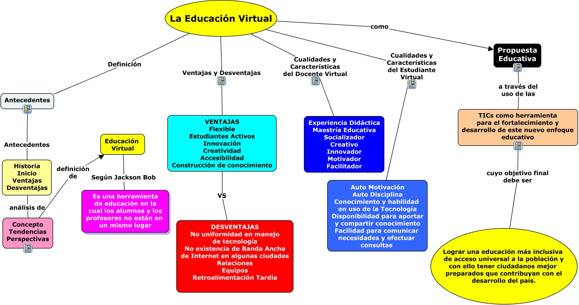 Este Cmap, tiene información relacionada con: USMP - Docencia virtual, VENTAJAS Flexible Estudiantes Activos Innovación Creatividad Accesibilidad Construcción de conocimiento VS DESVENTAJAS No uniformidad en manejo de tecnología No existencia de Banda Ancha de Internet en algunas ciudades Relaciones Equipos Retroalimentación Tardía, TICs como herramienta para el fortalecimiento y desarrollo de este nuevo enfoque educativo cuyo objetivo final debe ser Lograr una educación más inclusiva de acceso universal a la población y con ello tener ciudadanos mejor preparados que contribuyan con el desarrollo del país., La Educación Virtual Ventajas y Desventajas VENTAJAS Flexible Estudiantes Activos Innovación Creatividad Accesibilidad Construcción de conocimiento, Educación Virtual Según Jackson Bob Es una herramienta de educación en la cual los alumnos y los profesores no están en un mismo lugar, Propuesta Educativa a través del uso de las TICs como herramienta para el fortalecimiento y desarrollo de este nuevo enfoque educativo, Antecedentes Antecedentes Historia Inicio Ventajas Desventajas, Concepto Tendencias Perspectivas definición de Educación Virtual, La Educación Virtual como Propuesta Educativa, La Educación Virtual Cualidades y Características del Estudiante Virtual Auto Motivación Auto Disciplina Conocimiento y habilidad en uso de la Tecnología Disponibilidad para aportar y compartir conocimiento Facilidad para comunicar necesidades y efectuar consultas, Historia Inicio Ventajas Desventajas análisis de Concepto Tendencias Perspectivas, La Educación Virtual Definición Antecedentes, La Educación Virtual Cualidades y Características del Docente Virtual Experiencia Didáctica Maestría Educativa Socializador Creativo Innovador Motivador Facilitador