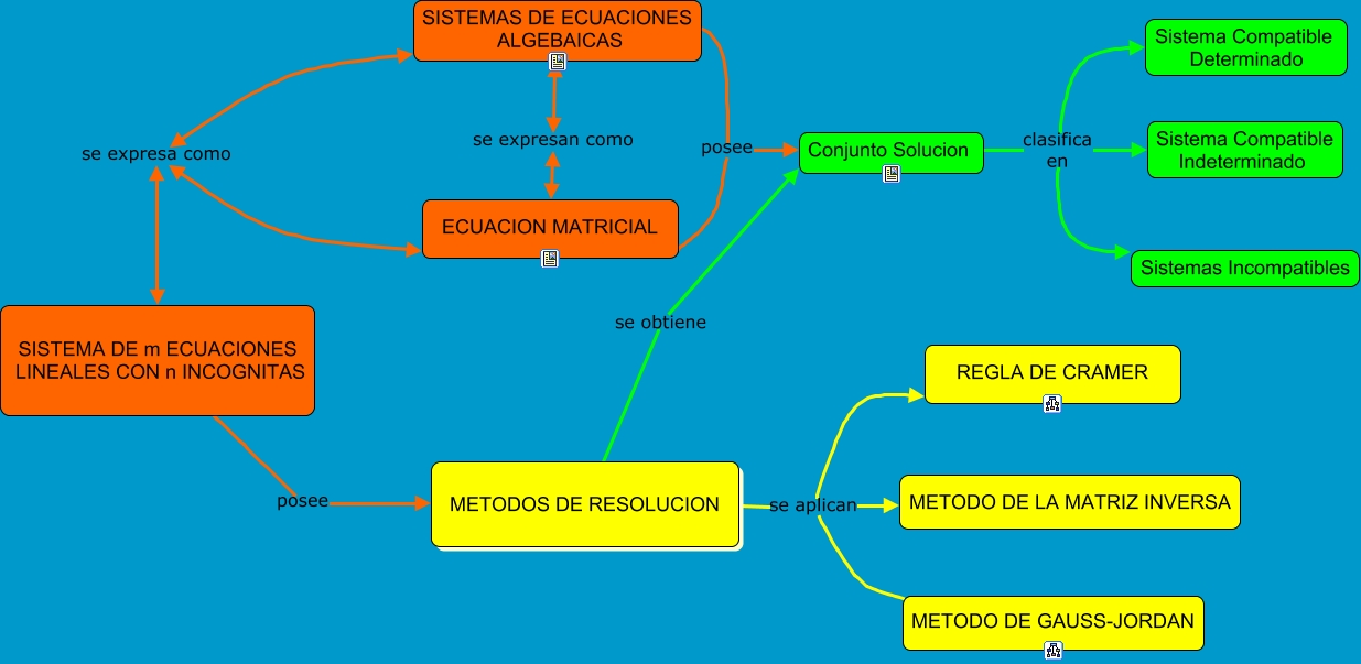 Este Cmap, tiene información relacionada con: SISTEMAS DE ECUACIONES LINEALES, METODOS DE RESOLUCION se obtiene Conjunto Solucion, SISTEMAS DE ECUACIONES ALGEBAICAS posee ECUACION MATRICIAL, METODOS DE RESOLUCION se aplican METODO DE GAUSS-JORDAN, METODOS DE RESOLUCION se aplican REGLA DE CRAMER, Conjunto Solucion clasifica en Sistema Compatible Determinado, SISTEMA DE m ECUACIONES LINEALES CON n INCOGNITAS se expresa como ECUACION MATRICIAL, SISTEMAS DE ECUACIONES ALGEBAICAS posee Conjunto Solucion, SISTEMA DE m ECUACIONES LINEALES CON n INCOGNITAS se expresa como SISTEMAS DE ECUACIONES ALGEBAICAS, Conjunto Solucion clasifica en Sistema Compatible Indeterminado, SISTEMA DE m ECUACIONES LINEALES CON n INCOGNITAS posee METODOS DE RESOLUCION, Conjunto Solucion clasifica en Sistemas Incompatibles, ECUACION MATRICIAL se expresan como SISTEMAS DE ECUACIONES ALGEBAICAS, METODOS DE RESOLUCION se aplican METODO DE LA MATRIZ INVERSA