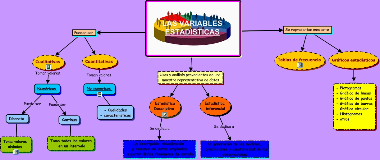Este Cmap, tiene información relacionada con: mapa conceptual de estadistica, Usos y análisis provenientes de una muestra representativa de datos ???? Estadística inferencial, Cualitativas Toman valores Numéricos, Numéricos Puede ser Continua, LAS VARIABLES ESTADÍSTICAS ???? Pueden ser, Usos y análisis provenientes de una muestra representativa de datos ???? Estadística Descriptiva, Discreta ???? Toma valores aislados, Continua ???? Tomo todos los valores en un intervalo, Pueden ser ???? Cuantitativas, Gráficos estadísticos Como - Pictogramas - Gráfico de lineas - Gráfico de puntos - Gráfico de barras - Gráfico circular - Histogramas - otros, Pueden ser ???? Cualitativas, LAS VARIABLES ESTADÍSTICAS ???? Se representan mediante, Cuantitativas Toman valores No numéricos, Se representan mediante ???? Tablas de frecuencia, No numéricos ???? - Cualidades - caracteristicas, Estadística inferencial Se dedica a la generación de los modelos, predicciones y aleatoriedad de las observaciones., LAS VARIABLES ESTADÍSTICAS La Estadística estudia Usos y análisis provenientes de una muestra representativa de datos, Numéricos Puede ser Discreta, Se representan mediante ???? Gráficos estadísticos, Estadística Descriptiva Se dedica a La descripción, visualización y resumen de datos originados a partir de los fenómenos de estudio