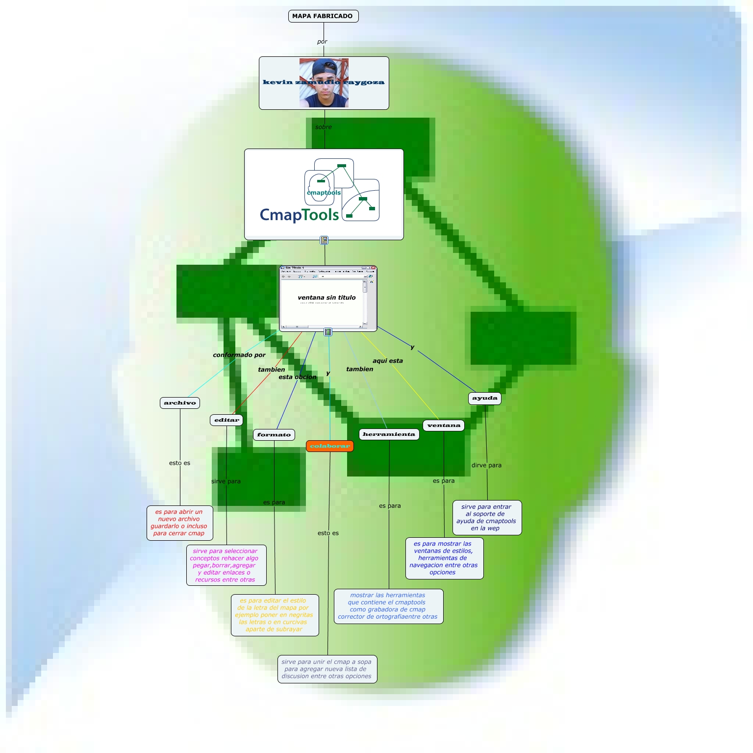 Este Cmap, tiene información relacionada con: Sin Título 2, colaborar esto es sirve para unir el cmap a sopa para agregar nueva lista de discusion entre otras opciones, MAPA FABRICADO por kevin zamudio raygoza, ventana sin titulo y ayuda, archivo esto es es para abrir un nuevo archivo guardarlo o incluso para cerrar cmap, editar sirve para sirve para seleccionar conceptos rehacer algo pegar,borrar,agregar y editar enlaces o recursos entre otras, formato es para es para editar el estilo de la letra del mapa por ejemplo poner en negritas las letras o en curcivas aparte de subrayar, ventana sin titulo conformado por archivo, ventana sin titulo aqui esta ventana, ventana sin titulo tambien herramienta, ventana sin titulo esta obcion formato, mostrar las herramientas que contiene el cmaptools como grabadora de cmap corrector de ortografiaentre otras es para herramienta, ventana sin titulo tambien editar, cmaptools ???? ventana sin titulo, ventana sin titulo y colaborar, kevin zamudio raygoza sobre cmaptools, ventana es para es para mostrar las ventanas de estilos, herramientas de navegacion entre otras opciones, ayuda dirve para sirve para entrar al soporte de ayuda de cmaptools en la wep