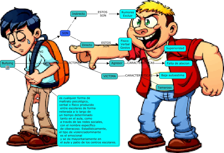 Este Cmap, tiene información relacionada con: bullying, Indirecto ESTOS SON Rumores Excluir, Agresor CARACTERISTICAS Superioridad, VICTIMA CARACTERISTICAS Temeroso, Bullying QUE ES es cualquier forma de maltrato psicológico, verbal o físico producido entre escolares de forma reiterada a lo largo de un tiempo determinado tanto en el aula, como a través de las redes sociales, con el nombre específico de ciberacoso. Estadísticamente, el tipo de violenciadominante es el emocional y se da mayoritariamente en el aula y patio de los centros escolares., VICTIMA CARACTERISTICAS Baja autoestima, Bullying VICTIMAS VICTIMA, SON Directo, Bullying TIPOS DE BULLYING SON, SON Indirecto, Directo ESTOS SON Fisico Verbal Gestos, Bullying VICTIMAS Agresor, Agresor CARACTERISTICAS Falta de atecion
