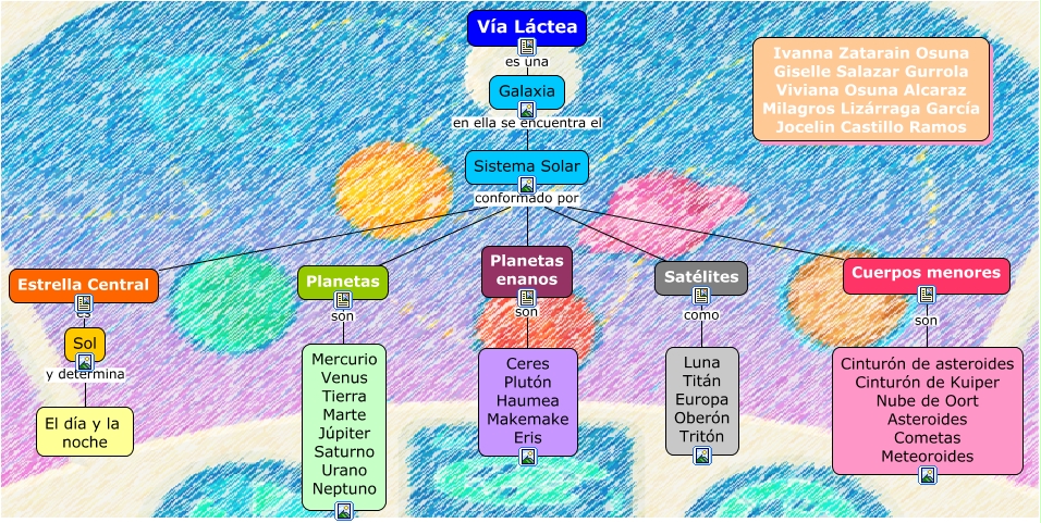 Este Cmap, tiene información relacionada con: Mapa conceptual de la Vía Láctea, Sistema Solar conformado por Cuerpos menores, Satélites como Luna Titán Europa Oberón Tritón, Planetas enanos son Ceres Plutón Haumea Makemake Eris, Cuerpos menores son Cinturón de asteroides Cinturón de Kuiper Nube de Oort Asteroides Cometas Meteoroides, Planetas son Mercurio Venus Tierra Marte Júpiter Saturno Urano Neptuno, Sistema Solar conformado por Planetas, Galaxia en ella se encuentra el Sistema Solar, Sistema Solar conformado por Satélites, Sistema Solar conformado por Estrella Central, Sol y determina El día y la noche, Vía Láctea es una Galaxia, Estrella Central es Sol, Sistema Solar conformado por Planetas enanos