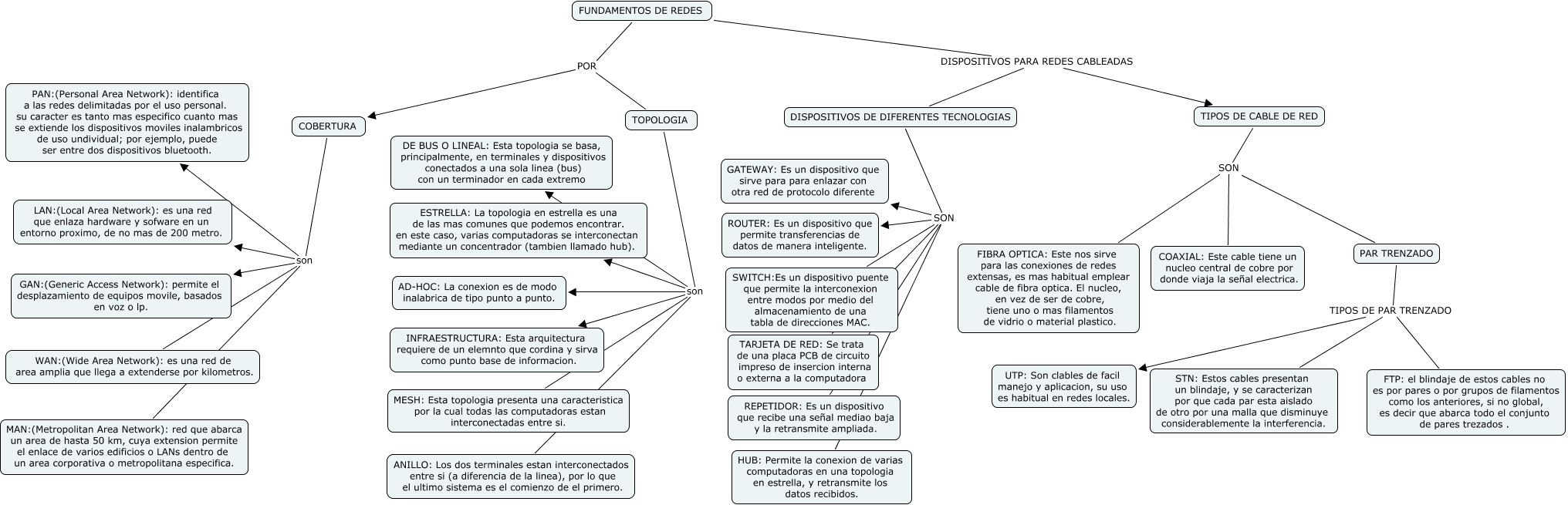 This Concept Map, created with IHMC CmapTools, has information related to: mapa conceptual de fundamento de redes, DISPOSITIVOS DE DIFERENTES TECNOLOGIAS SON SWITCH:Es un dispositivo puente que permite la interconexion entre modos por medio del almacenamiento de una tabla de direcciones MAC., FUNDAMENTOS DE REDES DISPOSITIVOS PARA REDES CABLEADAS TIPOS DE CABLE DE RED, COBERTURA son GAN:(Generic Access Network): permite el desplazamiento de equipos movile, basados en voz o lp., COBERTURA son WAN:(Wide Area Network): es una red de area amplia que llega a extenderse por kilometros., DISPOSITIVOS DE DIFERENTES TECNOLOGIAS SON HUB: Permite la conexion de varias computadoras en una topologia en estrella, y retransmite los datos recibidos., COBERTURA son LAN:(Local Area Network): es una red que enlaza hardware y sofware en un entorno proximo, de no mas de 200 metro., FUNDAMENTOS DE REDES DISPOSITIVOS PARA REDES CABLEADAS DISPOSITIVOS DE DIFERENTES TECNOLOGIAS, DISPOSITIVOS DE DIFERENTES TECNOLOGIAS SON GATEWAY: Es un dispositivo que sirve para para enlazar con otra red de protocolo diferente, PAR TRENZADO TIPOS DE PAR TRENZADO FTP: el blindaje de estos cables no es por pares o por grupos de filamentos como los anteriores, si no global, es decir que abarca todo el conjunto de pares trezados ., TOPOLOGIA son MESH: Esta topologia presenta una caracteristica por la cual todas las computadoras estan interconectadas entre si., TIPOS DE CABLE DE RED SON PAR TRENZADO, TOPOLOGIA son ANILLO: Los dos terminales estan interconectados entre si (a diferencia de la linea), por lo que el ultimo sistema es el comienzo de el primero., DISPOSITIVOS DE DIFERENTES TECNOLOGIAS SON ROUTER: Es un dispositivo que permite transferencias de datos de manera inteligente., FUNDAMENTOS DE REDES POR COBERTURA, TOPOLOGIA son ESTRELLA: La topologia en estrella es una de las mas comunes que podemos encontrar. en este caso, varias computadoras se interconectan mediante un concentrador (tambien llamado hub)., DISPOSITIVOS DE DIFERENTES TECNOLOGIAS SON TARJETA DE RED: Se trata de una placa PCB de circuito impreso de insercion interna o externa a la computadora, TIPOS DE CABLE DE RED SON FIBRA OPTICA: Este nos sirve para las conexiones de redes extensas, es mas habitual emplear cable de fibra optica. El nucleo, en vez de ser de cobre, tiene uno o mas filamentos de vidrio o material plastico., DISPOSITIVOS DE DIFERENTES TECNOLOGIAS SON REPETIDOR: Es un dispositivo que recibe una señal mediao baja y la retransmite ampliada., COBERTURA son PAN:(Personal Area Network): identifica a las redes delimitadas por el uso personal. su caracter es tanto mas especifico cuanto mas se extiende los dispositivos moviles inalambricos de uso undividual; por ejemplo, puede ser entre dos dispositivos bluetooth., TOPOLOGIA son DE BUS O LINEAL: Esta topologia se basa, principalmente, en terminales y dispositivos conectados a una sola linea (bus) con un terminador en cada extremo