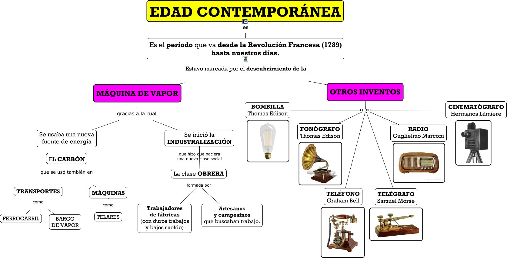 Este Cmap, tiene información relacionada con: EDAD CONTEMPOR�?NEA, OTROS INVENTOS como BOMBILLA Thomas Edison, M�?QUINA DE VAPOR gracias a la cual Se usaba una nueva fuente de energía, TRANSPORTES como FERROCARRIL, M�?QUINAS como TELARES, M�?QUINA DE VAPOR gracias a la cual Se inició la INDUSTRALIZACIÓN, Es el periodo que va desde la Revolución Francesa (1789) hasta nuestros días. Estuvo marcada por el descubrimiento de la M�?QUINA DE VAPOR, La clase OBRERA formada por Artesanos y campesinos que buscaban trabajo., EL CARBÓN que se usó también en M�?QUINAS, OTROS INVENTOS como RADIO Guglielmo Marconi, EDAD CONTEMPOR�?NEA es Es el periodo que va desde la Revolución Francesa (1789) hasta nuestros días., Se usaba una nueva fuente de energía ???? EL CARBÓN, OTROS INVENTOS como TELÉFONO Graham Bell, La clase OBRERA formada por Trabajadores de fábricas (con duros trabajos y bajos sueldo), OTROS INVENTOS como TELÉGRAFO Samuel Morse, EL CARBÓN que se usó también en TRANSPORTES, OTROS INVENTOS como FONÓGRAFO Thomas Edison, OTROS INVENTOS como CINEMATÓGRAFO Hermanos Lùmiere, Es el periodo que va desde la Revolución Francesa (1789) hasta nuestros días. Estuvo marcada por el descubrimiento de la OTROS INVENTOS, Se inició la INDUSTRALIZACIÓN que hizo que naciera una nueva clase social La clase OBRERA, TRANSPORTES como BARCO DE VAPOR