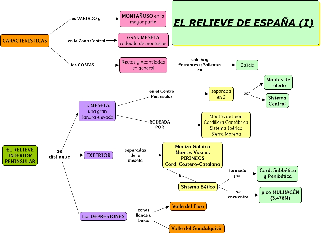 Este Cmap, tiene información relacionada con: 9.2 - EL RELIEVE DE ESPAÑA 1, Sistema Bético se encuentra pico MULHACÉN (3.478M), EXTERIOR separadas de la meseta Macizo Galaico Montes Vascos PIRINEOS Cord. Costero-Catalana, separada en 2 por Montes de Toledo, La MESETA: una gran llanura elevada en el Centro Peninsular separada en 2, Las DEPRESIONES zonas llanas y bajas Valle del Ebro, separada en 2 por Sistema Central, EL RELIEVE INTERIOR PENINSULAR se distingue Las DEPRESIONES, Las DEPRESIONES zonas llanas y bajas Valle del Guadalquivir, CARACTERISTICAS las COSTAS Rectas y Acantiladas en general, CARACTERISTICAS es VARIADO y MONTAÑOSO en la mayor parte, EL RELIEVE INTERIOR PENINSULAR se distingue La MESETA: una gran llanura elevada, La MESETA: una gran llanura elevada RODEADA POR Montes de León Cordillera Cantábrica Sistema Ibérico Sierra Morena, CARACTERISTICAS en la Zona Central GRAN MESETA rodeada de montañas, Sistema Bético formado por Cord. Subbética y Penibética, Macizo Galaico Montes Vascos PIRINEOS Cord. Costero-Catalana y Sistema Bético, EL RELIEVE INTERIOR PENINSULAR se distingue EXTERIOR, Rectas y Acantiladas en general solo hay Entrantes y Salientes en Galicia
