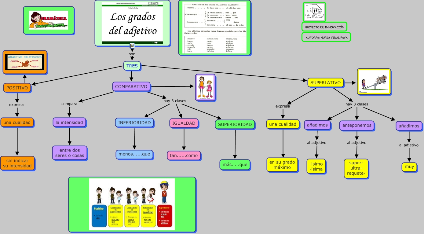 Este Cmap, tiene información relacionada con: TEMA 5 GRADOS DEL ADJETIVO, COMPARATIVO hay 3 clases SUPERIORIDAD, añadimos al adjetivo muy, SUPERLATIVO ????, una cualidad sin indicar sin indicar su intensidad, COMPARATIVO compara la intensidad, una cualidad en su grado en su grado máximo, TRES ???? SUPERLATIVO, COMPARATIVO ????, IGUALDAD ???? tan......como, SUPERLATIVO hay 3 clases añadimos, TRES ???? COMPARATIVO, POSITIVO ????, COMPARATIVO hay 3 clases INFERIORIDAD, POSITIVO expresa una cualidad, SUPERIORIDAD ???? más.....que, SUPERLATIVO hay 3 clases añadimos, TRES ???? POSITIVO, anteponemos al adjetivo super- ultra- requete-, SUPERLATIVO hay 3 clases anteponemos, INFERIORIDAD ???? menos......que