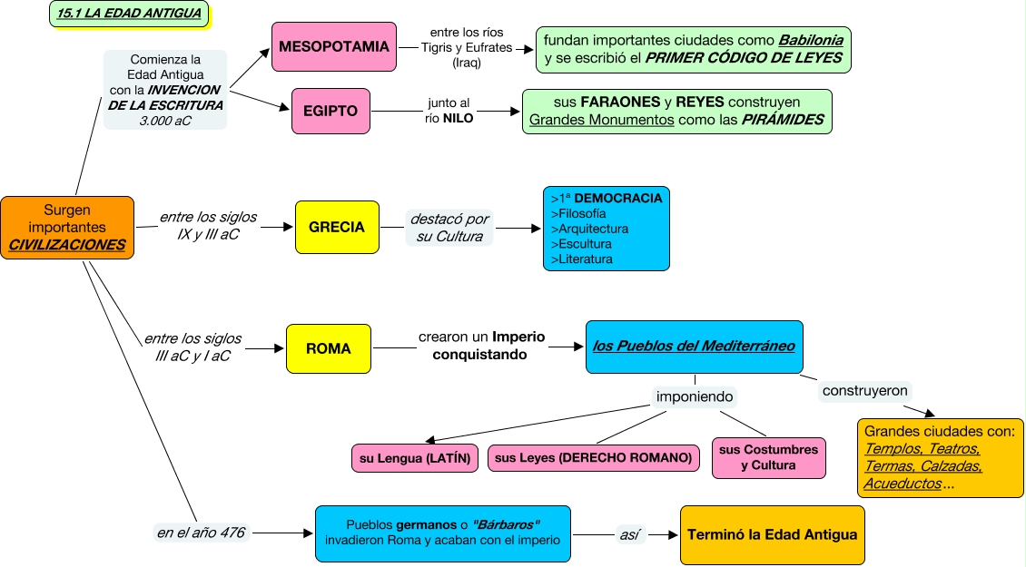 Este Cmap, tiene información relacionada con: 15.1 - LA EDAD ANTIGUA, Surgen importantes CIVILIZACIONES entre los siglos III aC y I aC ROMA, Surgen importantes CIVILIZACIONES entre los siglos IX y III aC GRECIA, GRECIA destacó por su Cultura ɭª DEMOCRACIA >Filosofía >Arquitectura >Escultura >Literatura, los Pueblos del Mediterráneo construyeron Grandes ciudades con: Templos, Teatros, Termas, Calzadas, Acueductos..., los Pueblos del Mediterráneo imponiendo su Lengua (LAT�?N), Surgen importantes CIVILIZACIONES Comienza la Edad Antigua con la INVENCION DE LA ESCRITURA 3.000 aC EGIPTO, MESOPOTAMIA entre los ríos Tigris y Eufrates (Iraq) fundan importantes ciudades como Babilonia y se escribió el PRIMER CÓDIGO DE LEYES, ROMA crearon un Imperio conquistando los Pueblos del Mediterráneo, los Pueblos del Mediterráneo imponiendo sus Leyes (DERECHO ROMANO), los Pueblos del Mediterráneo imponiendo sus Costumbres y Cultura, Surgen importantes CIVILIZACIONES en el año 476 Pueblos germanos o "Bárbaros" invadieron Roma y acaban con el imperio, Surgen importantes CIVILIZACIONES Comienza la Edad Antigua con la INVENCION DE LA ESCRITURA 3.000 aC MESOPOTAMIA, EGIPTO junto al río NILO sus FARAONES y REYES construyen Grandes Monumentos como las PIR�?MIDES, Pueblos germanos o "Bárbaros" invadieron Roma y acaban con el imperio así Terminó la Edad Antigua