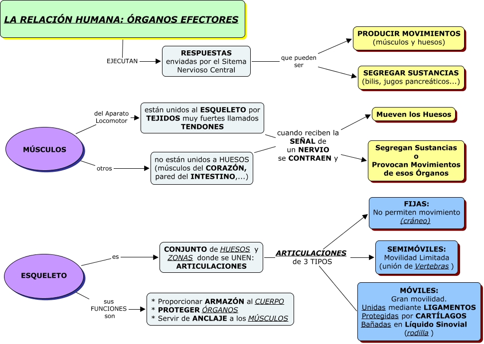 Este Cmap, tiene información relacionada con: LA RELACIÓN HUMANA - 3 - ÓRGANOS EFECTORES, CONJUNTO de HUESOS y ZONAS donde se UNEN: ARTICULACIONES ARTICULACIONES de 3 TIPOS MÓVILES: Gran movilidad. Unidas mediante LIGAMENTOS Protegidas por CART�?LAGOS Bañadas en Líquido Sinovial (rodilla), no están unidos a HUESOS (músculos del CORAZÓN, pared del INTESTINO,...) cuando reciben la SEÑAL de un NERVIO se CONTRAEN y Mueven los Huesos, están unidos al ESQUELETO por TEJIDOS muy fuertes llamados TENDONES cuando reciben la SEÑAL de un NERVIO se CONTRAEN y Mueven los Huesos, CONJUNTO de HUESOS y ZONAS donde se UNEN: ARTICULACIONES ARTICULACIONES de 3 TIPOS FIJAS: No permiten movimiento (cráneo), RESPUESTAS enviadas por el Sitema Nervioso Central que pueden ser PRODUCIR MOVIMIENTOS (músculos y huesos), MÚSCULOS otros no están unidos a HUESOS (músculos del CORAZÓN, pared del INTESTINO,...), MÚSCULOS del Aparato Locomotor están unidos al ESQUELETO por TEJIDOS muy fuertes llamados TENDONES, ESQUELETO es CONJUNTO de HUESOS y ZONAS donde se UNEN: ARTICULACIONES, LA RELACIÓN HUMANA: ÓRGANOS EFECTORES EJECUTAN RESPUESTAS enviadas por el Sitema Nervioso Central, están unidos al ESQUELETO por TEJIDOS muy fuertes llamados TENDONES cuando reciben la SEÑAL de un NERVIO se CONTRAEN y Segregan Sustancias o Provocan Movimientos de esos Órganos, no están unidos a HUESOS (músculos del CORAZÓN, pared del INTESTINO,...) cuando reciben la SEÑAL de un NERVIO se CONTRAEN y Segregan Sustancias o Provocan Movimientos de esos Órganos, CONJUNTO de HUESOS y ZONAS donde se UNEN: ARTICULACIONES ARTICULACIONES de 3 TIPOS SEMIMÓVILES: Movilidad Limitada (unión de Vertebras), ESQUELETO sus FUNCIONES son * Proporcionar ARMAZÓN al CUERPO * PROTEGER ÓRGANOS * Servir de ANCLAJE a los MÚSCULOS, RESPUESTAS enviadas por el Sitema Nervioso Central que pueden ser SEGREGAR SUSTANCIAS (bilis, jugos pancreáticos...)