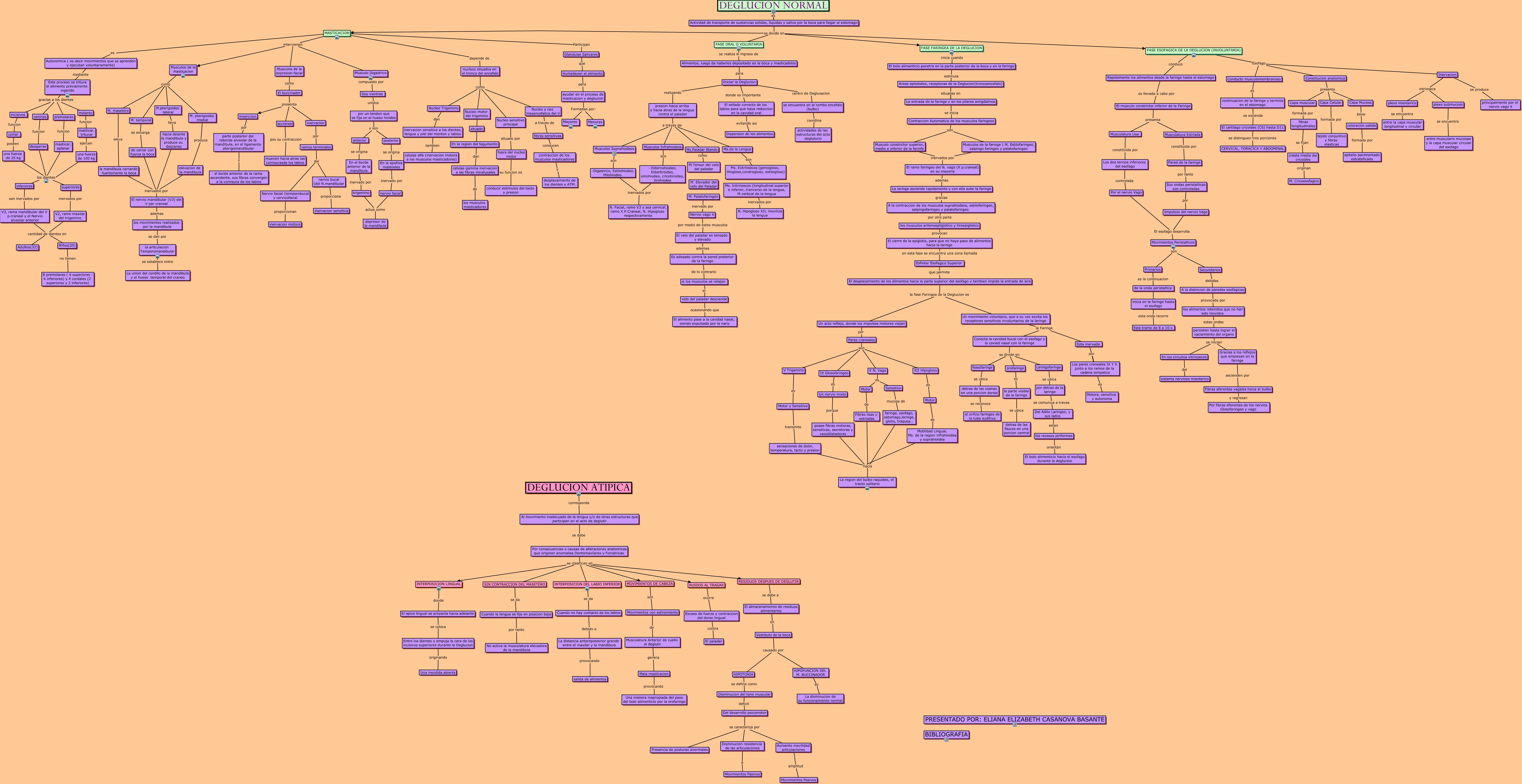 Este Cmap, tiene información relacionada con: MAPA CONCEPTUAL DEGLUCION NORMAL Y ATIPICA, Musculos de la masticacion como M. temporal, El apice lingual se proyecta hacia adelante se coloca Entre los dientes o empuja la cara de los incisivos superiores durante la Deglucion, presion hacia arriba y hacia atras de la lengua contra el paladar a traves de Ms.Paladar Blando, El desplazamiento de los alimentos hacia la parte superior del esofago y tambien impide la entrada de aire la fase Faringea de la Deglucion es Un movimiento voluntario, que a su vez excita los receptores sensitivos involuntarios de la laringe, persisten hasta lograr el vaciamiento del organo se inician En los circuitos intrinsecos, Exceso de fuerza y contraccion del dorso lingual contra El paladar, X N, Vago es Motor, una fuerza de 100 kg los dientes inferiores, Por consecuencias o causas de alteraciones anatomicas que originan anomalias Dentomaxilares y Foniatricas se clasifican en SIN CONTRACCION DEL MASETERO, RESIDUOS DESPUES DE DEGLUTIR se debe a El almacenamiento de residuos alimentarios, ayudar en el proceso de masticacion y deglucion Formadas por: Menores, El buccinador presenta acciones, -Digastrico, Estilohiodeo, Milohiodeo. inervados por N. Facial, ramo V3 y asa cervical, ramo X P.Craneal, N. Hipogloso respectivamente, V2, ramo maxilar del trigemino cantidad de dientes en Niños(20), faringe, esofago, estomago,laringe, glotis, traquea.. hacia La region del bulbo raquideo, el tracto solitario, M. masetero eleva la mandibula cerrando fuertemente la boca, En los circuitos intrinsecos del sistema nervioso mienterico, Areas epiteliales, receptoras de la Deglucion(troncoencefalo) situadas en La entrada de la faringe y en los pilares amigdalinos, Inervacion intrinseca plexo mienterico, MOVIMIENTOS DE CABEZA son Movimientos con estiramiento