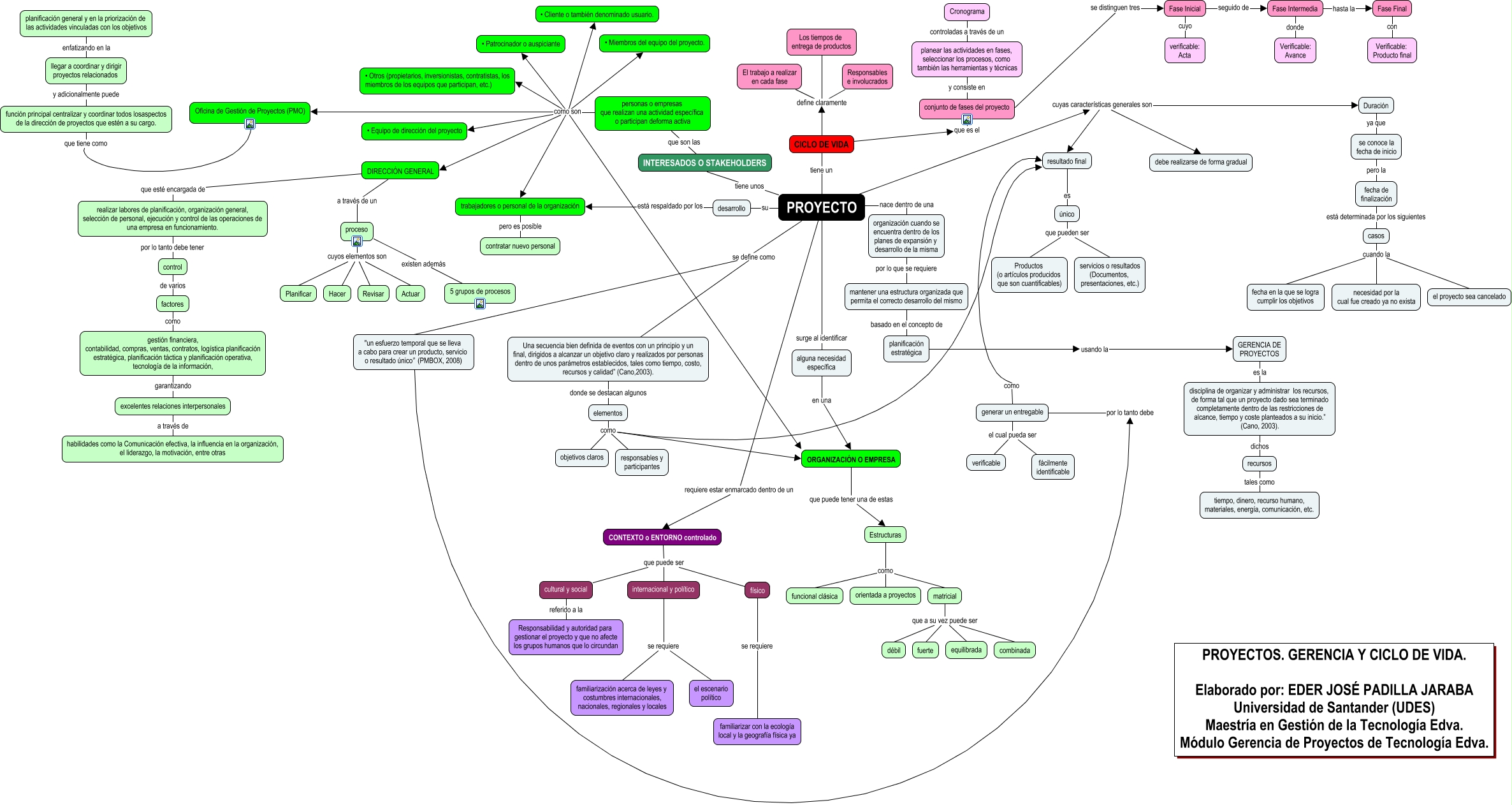 Este Cmap, tiene información relacionada con: Proyectos. Gerencia y Ciclo de vida v2.0, personas o empresas que realizan una actividad específica o participan deforma activa como son Oficina de Gestión de Proyectos (PMO), CICLO DE VIDA define claramente Responsables e involucrados, generar un entregable como resultado final, "un esfuerzo temporal que se lleva a cabo para crear un producto, servicio o resultado único” (PMBOX, 2008) por lo tanto debe generar un entregable, Fase Inicial seguido de Fase Intermedia, CICLO DE VIDA define claramente El trabajo a realizar en cada fase, realizar labores de planificación, organización general, selección de personal, ejecución y control de las operaciones de una empresa en funcionamiento. por lo tanto debe tener control, generar un entregable el cual pueda ser fácilmente identificable, INTERESADOS O STAKEHOLDERS que son las personas o empresas que realizan una actividad específica o participan deforma activa, proceso cuyos elementos son Actuar, ORGANIZACIÓN O EMPRESA que puede tener una de estas Estructuras, GERENCIA DE PROYECTOS es la disciplina de organizar y administrar los recursos, de forma tal que un proyecto dado sea terminado completamente dentro de las restricciones de alcance, tiempo y coste planteados a su inicio.” (Cano, 2003)., elementos como ORGANIZACIÓN O EMPRESA, casos cuando la necesidad por la cual fue creado ya no exista, casos cuando la fecha en la que se logra cumplir los objetivos, personas o empresas que realizan una actividad específica o participan deforma activa como son • Miembros del equipo del proyecto., proceso cuyos elementos son Planificar, PROYECTO su desarrollo, mantener una estructura organizada que permita el correcto desarrollo del mismo basado en el concepto de planificación estratégica, personas o empresas que realizan una actividad específica o participan deforma activa como son • Cliente o también denominado usuario.