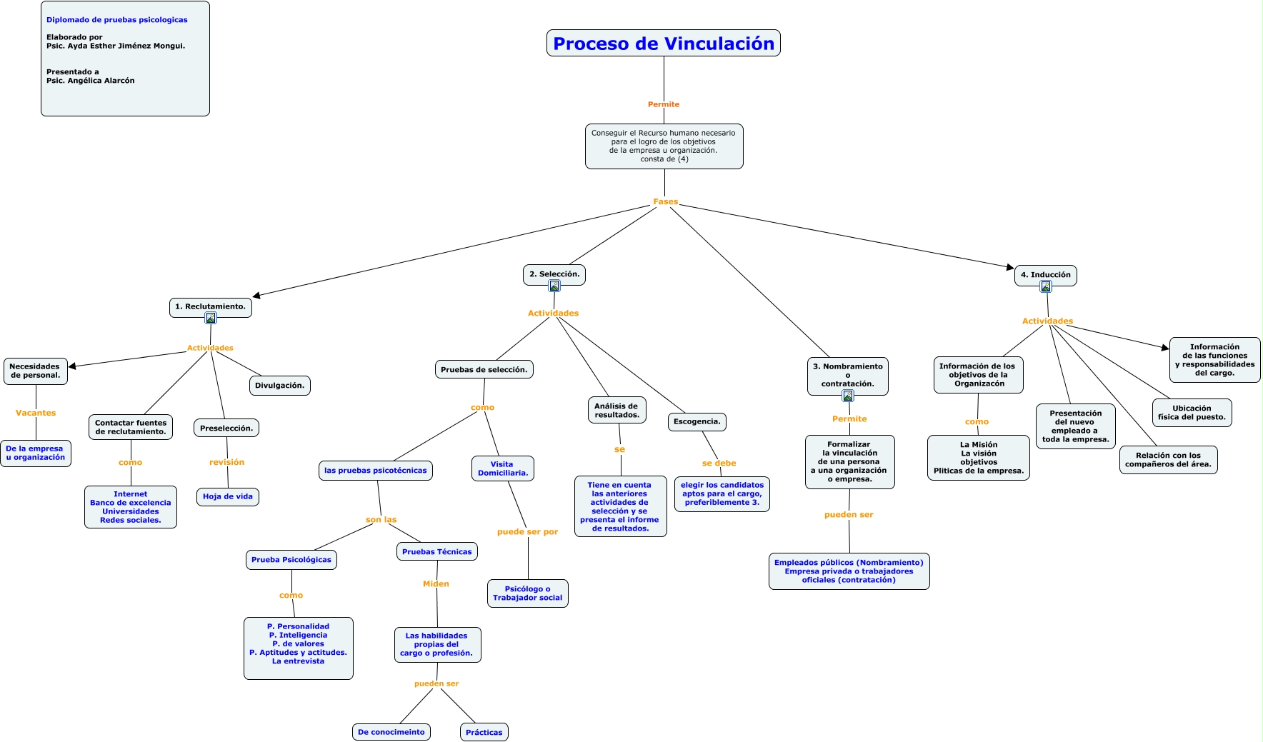 Este Cmap, tiene información relacionada con: Mapa Conceptual Proceso de vinculación, Proceso de Vinculación Permite Conseguir el Recurso humano necesario para el logro de los objetivos de la empresa u organización. consta de (4), 2. Selección. Actividades Escogencia., Información de los objetivos de la Organizacón como La Misión La visión objetivos Pliticas de la empresa., 1. Reclutamiento. Actividades Necesidades de personal., Conseguir el Recurso humano necesario para el logro de los objetivos de la empresa u organización. consta de (4) Fases 2. Selección., 4. Inducción Actividades Presentación del nuevo empleado a toda la empresa., 2. Selección. Actividades Análisis de resultados., Contactar fuentes de reclutamiento. como Internet Banco de excelencia Universidades Redes sociales., 1. Reclutamiento. Actividades Contactar fuentes de reclutamiento., Escogencia. se debe elegir los candidatos aptos para el cargo, preferiblemente 3., Análisis de resultados. se Tiene en cuenta las anteriores actividades de selección y se presenta el informe de resultados., Preselección. revisión Hoja de vida, Conseguir el Recurso humano necesario para el logro de los objetivos de la empresa u organización. consta de (4) Fases 4. Inducción, 4. Inducción Actividades Información de los objetivos de la Organizacón, 2. Selección. Actividades Pruebas de selección., 3. Nombramiento o contratación. Permite Formalizar la vinculación de una persona a una organización o empresa., Conseguir el Recurso humano necesario para el logro de los objetivos de la empresa u organización. consta de (4) Fases 1. Reclutamiento., Las habilidades propias del cargo o profesión. pueden ser Prácticas, Las habilidades propias del cargo o profesión. pueden ser De conocimeinto, 4. Inducción Actividades Relación con los compañeros del área.