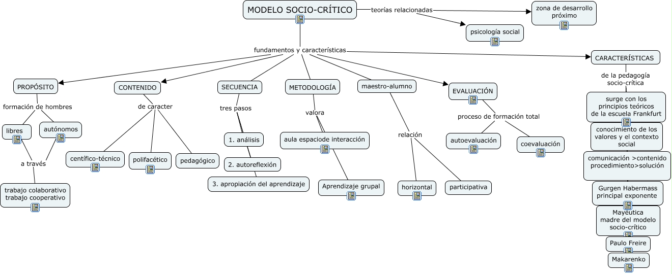 Este Cmap, tiene información relacionada con: modelo socio crítico, MODELO SOCIO-CRÍTICO fundamentos y características METODOLOGÍA, autónomos a través trabajo colaborativo trabajo cooperativo, CONTENIDO de caracter pedagógico, libres a través trabajo colaborativo trabajo cooperativo, maestro-alumno relación participativa, surge con los principios teóricos de la escuela Frankfurt de la pedagogía socio-crítica Makarenko, SECUENCIA tres pasos 3. apropiación del aprendizaje, CARACTERÍSTICAS de la pedagogía socio-crítica Makarenko, surge con los principios teóricos de la escuela Frankfurt de la pedagogía socio-crítica conocimiento de los valores y el contexto social, CARACTERÍSTICAS de la pedagogía socio-crítica Paulo Freire, MODELO SOCIO-CRÍTICO fundamentos y características CONTENIDO, CARACTERÍSTICAS de la pedagogía socio-crítica Gurgen Habermass principal exponente, surge con los principios teóricos de la escuela Frankfurt de la pedagogía socio-crítica comunicación >contenido procedimiento>solución, CONTENIDO de caracter polifacético, MODELO SOCIO-CRÍTICO fundamentos y características SECUENCIA, METODOLOGÍA valora Aprendizaje grupal, MODELO SOCIO-CRÍTICO fundamentos y características EVALUACIÓN, CARACTERÍSTICAS de la pedagogía socio-crítica Mayéutica madre del modelo socio-crítico, CARACTERÍSTICAS de la pedagogía socio-crítica surge con los principios teóricos de la escuela Frankfurt, CONTENIDO de caracter centífico-técnico
