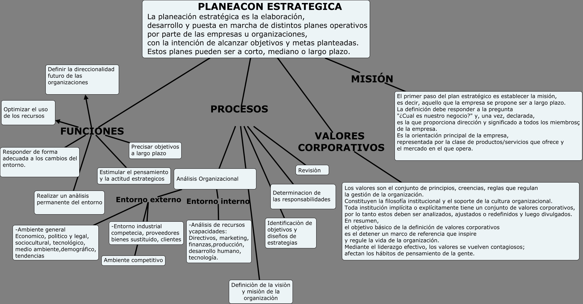 Este Cmap, tiene información relacionada con: Trabajo colaborativo, PLANEACON ESTRATEGICA La planeación estratégica es la elaboración, desarrollo y puesta en marcha de distintos planes operativos por parte de las empresas u organizaciones, con la intención de alcanzar objetivos y metas planteadas. Estos planes pueden ser a corto, mediano o largo plazo. PROCESOS Análisis Organizacional, PLANEACON ESTRATEGICA La planeación estratégica es la elaboración, desarrollo y puesta en marcha de distintos planes operativos por parte de las empresas u organizaciones, con la intención de alcanzar objetivos y metas planteadas. Estos planes pueden ser a corto, mediano o largo plazo. FUNCIONES Estimular el pensamiento y la actitud estrategicos, PLANEACON ESTRATEGICA La planeación estratégica es la elaboración, desarrollo y puesta en marcha de distintos planes operativos por parte de las empresas u organizaciones, con la intención de alcanzar objetivos y metas planteadas. Estos planes pueden ser a corto, mediano o largo plazo. PROCESOS Revisiòn, PLANEACON ESTRATEGICA La planeación estratégica es la elaboración, desarrollo y puesta en marcha de distintos planes operativos por parte de las empresas u organizaciones, con la intención de alcanzar objetivos y metas planteadas. Estos planes pueden ser a corto, mediano o largo plazo. FUNCIONES Definir la direccionalidad futuro de las organizaciones, PLANEACON ESTRATEGICA La planeación estratégica es la elaboración, desarrollo y puesta en marcha de distintos planes operativos por parte de las empresas u organizaciones, con la intención de alcanzar objetivos y metas planteadas. Estos planes pueden ser a corto, mediano o largo plazo. FUNCIONES Responder de forma adecuada a los cambios del entorno., Análisis Organizacional Entorno externo -Ambiente general Economico, politico y legal, sociocultural, tecnológico, medio ambiente,demográfico, tendencias, PLANEACON ESTRATEGICA La planeación estratégica es la elaboración, desarrollo y puesta en marcha de distintos planes operativos por parte de las empresas u organizaciones, con la intención de alcanzar objetivos y metas planteadas. Estos planes pueden ser a corto, mediano o largo plazo. PROCESOS Determinacion de las responsabilidades, Análisis Organizacional Entorno externo -Entorno industrial competecia, proveedores bienes sustituido, clientes, PLANEACON ESTRATEGICA La planeación estratégica es la elaboración, desarrollo y puesta en marcha de distintos planes operativos por parte de las empresas u organizaciones, con la intención de alcanzar objetivos y metas planteadas. Estos planes pueden ser a corto, mediano o largo plazo. FUNCIONES Precisar objetivos a largo plazo, Análisis Organizacional Entorno externo Ambiente competitivo, PLANEACON ESTRATEGICA La planeación estratégica es la elaboración, desarrollo y puesta en marcha de distintos planes operativos por parte de las empresas u organizaciones, con la intención de alcanzar objetivos y metas planteadas. Estos planes pueden ser a corto, mediano o largo plazo. PROCESOS Definiciòn de la visiòn y misiòn de la organizaciòn, PLANEACON ESTRATEGICA La planeación estratégica es la elaboración, desarrollo y puesta en marcha de distintos planes operativos por parte de las empresas u organizaciones, con la intención de alcanzar objetivos y metas planteadas. Estos planes pueden ser a corto, mediano o largo plazo. VALORES CORPORATIVOS Los valores son el conjunto de principios, creencias, reglas que regulan la gestión de la organización. Constituyen la filosofía institucional y el soporte de la cultura organizacional. Toda institución implícita o explícitamente tiene un conjunto de valores corporativos, por lo tanto estos deben ser analizados, ajustados o redefinidos y luego divulgados. En resumen, el objetivo básico de la definición de valores corporativos es el detener un marco de referencia que inspire y regule la vida de la organización. Mediante el liderazgo efectivo, los valores se vuelven contagiosos; afectan los hábitos de pensamiento de la gente., PLANEACON ESTRATEGICA La planeación estratégica es la elaboración, desarrollo y puesta en marcha de distintos planes operativos por parte de las empresas u organizaciones, con la intención de alcanzar objetivos y metas planteadas. Estos planes pueden ser a corto, mediano o largo plazo. PROCESOS Identificaciòn de objetivos y diseños de estrategias, PLANEACON ESTRATEGICA La planeación estratégica es la elaboración, desarrollo y puesta en marcha de distintos planes operativos por parte de las empresas u organizaciones, con la intención de alcanzar objetivos y metas planteadas. Estos planes pueden ser a corto, mediano o largo plazo. FUNCIONES Realizar un anàlisis permanente del entorno, PLANEACON ESTRATEGICA La planeación estratégica es la elaboración, desarrollo y puesta en marcha de distintos planes operativos por parte de las empresas u organizaciones, con la intención de alcanzar objetivos y metas planteadas. Estos planes pueden ser a corto, mediano o largo plazo. MISIÓN El primer paso del plan estratégico es establecer la misión, es decir, aquello que la empresa se propone ser a largo plazo. La definición debe responder a la pregunta "¿Cual es nuestro negocio?" y, una vez, declarada, es la que proporciona dirección y significado a todos los miembrosç de la empresa. Es la orientación principal de la empresa, representada por la clase de productos/servicios que ofrece y el mercado en el que opera., PLANEACON ESTRATEGICA La planeación estratégica es la elaboración, desarrollo y puesta en marcha de distintos planes operativos por parte de las empresas u organizaciones, con la intención de alcanzar objetivos y metas planteadas. Estos planes pueden ser a corto, mediano o largo plazo. FUNCIONES Optimizar el uso de los recursos, Análisis Organizacional Entorno interno -Análisis de recursos ycapacidades: Directivos, marketing, finanzas,producción, de