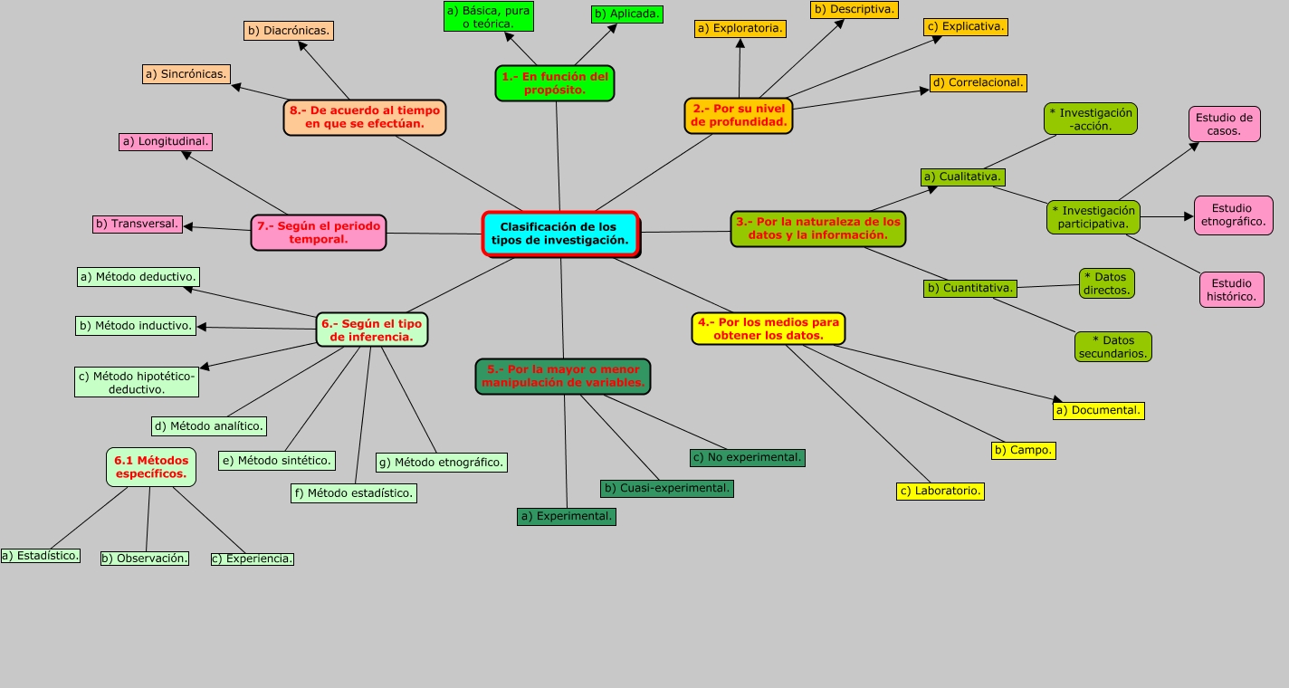 Este Cmap, tiene información relacionada con: Clasificación de la investigación, Clasificación de los tipos de investigación. 4.- Por los medios para obtener los datos. b) Campo., Clasificación de los tipos de investigación. 6.- Según el tipo de inferencia. a) Método deductivo., Clasificación de los tipos de investigación. 3.- Por la naturaleza de los datos y la información. b) Cuantitativa., Clasificación de los tipos de investigación. 5.- Por la mayor o menor manipulación de variables. a) Experimental., Clasificación de los tipos de investigación. 8.- De acuerdo al tiempo en que se efectúan. a) Sincrónicas., 6.1 Métodos específicos. c) Experiencia., Clasificación de los tipos de investigación. 6.- Según el tipo de inferencia. d) Método analítico., b) Cuantitativa. * Datos secundarios., Clasificación de los tipos de investigación. 1.- En función del propósito. a) Básica, pura o teórica., Clasificación de los tipos de investigación. 2.- Por su nivel de profundidad. a) Exploratoria., 6.1 Métodos específicos. b) Observación., Clasificación de los tipos de investigación. 2.- Por su nivel de profundidad. d) Correlacional., Clasificación de los tipos de investigación. 7.- Según el periodo temporal. b) Transversal., a) Cualitativa. * Investigación participativa. Estudio de casos., Clasificación de los tipos de investigación. 6.- Según el tipo de inferencia. f) Método estadístico., Clasificación de los tipos de investigación. 1.- En función del propósito. b) Aplicada., a) Cualitativa. * Investigación participativa. Estudio etnográfico., Clasificación de los tipos de investigación. 5.- Por la mayor o menor manipulación de variables. b) Cuasi-experimental., a) Cualitativa. * Investigación participativa. Estudio histórico., Clasificación de los tipos de investigación. 6.- Según el tipo de inferencia. e) Método sintético.