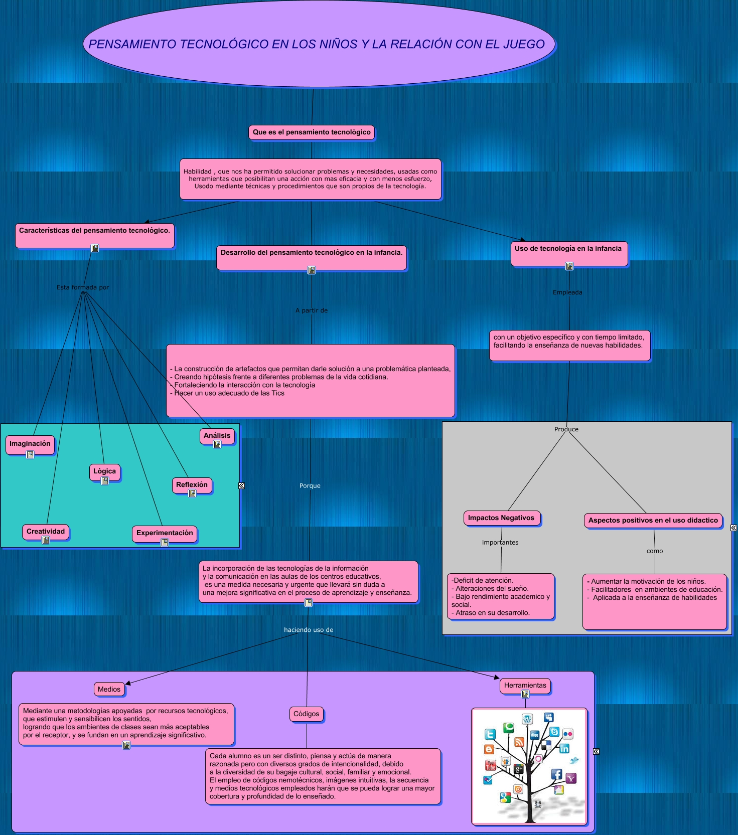 Este Cmap, tiene información relacionada con: Pensamiento tecnológico en los niños y la relacion con el juego, Características del pensamiento tecnológico. Esta formada por Experimentación, Desarrollo del pensamiento tecnológico en la infancia. A partir de - La construcción de artefactos que permitan darle solución a una problemática planteada, - Creando hipótesis frente a diferentes problemas de la vida cotidiana. - Fortaleciendo la interacción con la tecnología - Hacer un uso adecuado de las Tics, Aspectos positivos en el uso didactico como - Aumentar la motivación de los niños. - Facilitadores en ambientes de educación. - Aplicada a la enseñanza de habilidades, Que es el pensamiento tecnológico ???? Uso de tecnología en la infancia, Que es el pensamiento tecnológico ???? Desarrollo del pensamiento tecnológico en la infancia., Características del pensamiento tecnológico. Esta formada por Análisis, La incorporación de las tecnologías de la información y la comunicación en las aulas de los centros educativos, es una medida necesaria y urgente que llevará sin duda a una mejora significativa en el proceso de aprendizaje y enseñanza. haciendo uso de Medios, Que es el pensamiento tecnológico ???? Habilidad , que nos ha permitido solucionar problemas y necesidades, usadas como herramientas que posibilitan una acción con mas eficacia y con menos esfuerzo, Usodo mediante técnicas y procedimientos que son propios de la tecnología., - La construcción de artefactos que permitan darle solución a una problemática planteada, - Creando hipótesis frente a diferentes problemas de la vida cotidiana. - Fortaleciendo la interacción con la tecnología - Hacer un uso adecuado de las Tics Porque La incorporación de las tecnologías de la información y la comunicación en las aulas de los centros educativos, es una medida necesaria y urgente que llevará sin duda a una mejora significativa en el proceso de aprendizaje y enseñanza., Uso de tecnología en la infancia Empleada con un objetivo específico y con tiempo limitado, facilitando la enseñanza de nuevas habilidades., Características del pensamiento tecnológico. Esta formada por Creatividad, Características del pensamiento tecnológico. Esta formada por Lógica, La incorporación de las tecnologías de la información y la comunicación en las aulas de los centros educativos, es una medida necesaria y urgente que llevará sin duda a una mejora significativa en el proceso de aprendizaje y enseñanza. haciendo uso de Herramientas, con un objetivo específico y con tiempo limitado, facilitando la enseñanza de nuevas habilidades. Produce Impactos Negativos, Características del pensamiento tecnológico. Esta formada por Imaginación, PENSAMIENTO TECNOLÓGICO EN LOS NIÑOS Y LA RELACIÓN CON EL JUEGO ???? Que es el pensamiento tecnológico, Impactos Negativos importantes -Deficit de atención. - Alteraciones del sueño. - Bajo rendimiento academico y social. - Atraso en su desarrollo., Códigos Cada alumno es un ser distinto, piensa y actúa de manera razonada pero con diversos grados de intencionalidad, debido a la diversidad de su bagaje cultural, social, familiar y emocional. El empleo de códigos nemotécnicos, imágenes intuitivas, la secuencia y medios tecnológicos empleados harán que se pueda lograr una mayor cobertura y profundidad de lo enseñado., La incorporación de las tecnologías de la información y la comunicación en las aulas de los centros educativos, es una medida necesaria y urgente que llevará sin duda a una mejora significativa en el proceso de aprendizaje y enseñanza. haciendo uso de Códigos, Características del pensamiento tecnológico. Esta formada por Reflexión