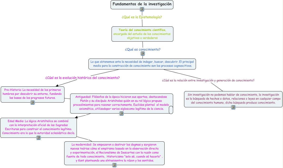 Este Cmap, tiene información relacionada con: Mapa conceptual Fase 2, Edad Media: La lógica Aristótelica se combinó con la interpretación oficial de las Sagradas Escrituras para construir el conocimiento legítimo. Conocimiento era lo que la autoridad eclesiástica decía. La modernidad: Se empezaron a destruir los dogmas y surgieron nuevas teórias cómo el empírismo basado en la observación directa y experimentación, el Racionalismo de Descartes con la razón como fuente de todo conocimiento, Historicismo "solo sé, cuando sé hacerlo" , y Kant planteando una síntesisentre la rázon y los sentidos., Lo que obtenemos ante la necesidad de indagar, buscar, descubrir. El principal medio para la construcción de conocimiento son los procesos cognoscitivos. ¿Cúal es la relación entre investigación y generación de conocimiento? Sin investigación no podemos hablar de conocimiento, la investigación es la búsqueda de hechos o datos, relaciones o leyes en cualquier campo del conocimiento humano, dicha búsqueda produce conocimiento., Lo que obtenemos ante la necesidad de indagar, buscar, descubrir. El principal medio para la construcción de conocimiento son los procesos cognoscitivos. ¿Cúal es la evolución histórica del conocimiento? Pre-Historia: La necesidad de los primeros hombres por descubrir su entorno, fundando las bases de los progresos futuros., Fundamentos de la investigación ¿Qué es la Epistemología? Teoría del conocimiento científico, encargada del estudio de los conocimientos objetivos o verdaderos, Pre-Historia: La necesidad de los primeros hombres por descubrir su entorno, fundando las bases de los progresos futuros. ????, Teoría del conocimiento científico, encargada del estudio de los conocimientos objetivos o verdaderos ¿Qué es conocimiento? Lo que obtenemos ante la necesidad de indagar, buscar, descubrir. El principal medio para la construcción de conocimiento son los procesos cognoscitivos., Antiguedad: Filósofos de la época hicieron sus aportes, destacandose Platón y su discípulo Aristóteles quién en su rol lógico propuso procedimientos para razonar correctamente. Euclides planteó el modelo axiomático, utilizadopor varios sigloscomo legítimo de la ciencia. Edad Media: La lógica Aristótelica se combinó con la interpretación oficial de las Sagradas Escrituras para construir el conocimiento legítimo. Conocimiento era lo que la autoridad eclesiástica decía.