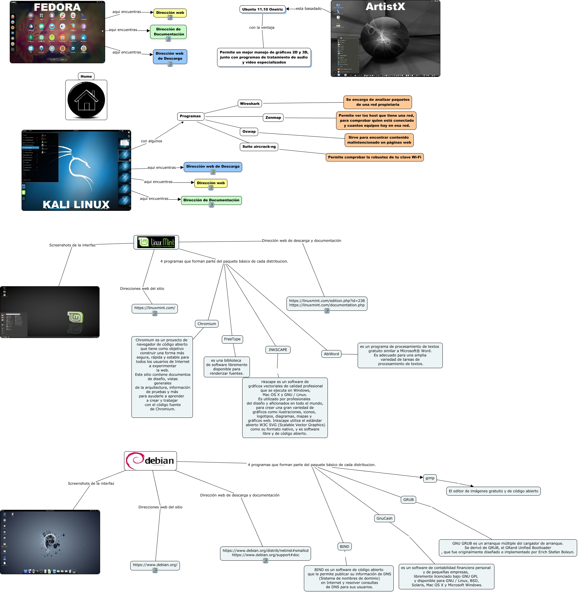 Este Cmap, tiene información relacionada con: Distribuciones Linux, FreeType es una biblioteca de software libremente disponible para renderizar fuentes., Programas ???? Suite aircrack-ng, ???? 4 programas que forman parte del paquete básico de cada distribucion. AbiWord, FEDORA aqui encuentras Dirección web, FEDORA aqui encuentras Dirección web de Descarga, ???? 4 programas que forman parte del paquete básico de cada distribucion. INKSCAPE, Suite aircrack-ng ???? Permite comprobar la robustez de tu clave Wi-Fi, INKSCAPE nkscape es un software de gráficos vectoriales de calidad profesional que se ejecuta en Windows, Mac OS X y GNU / Linux. Es utilizado por profesionales del diseño y aficionados en todo el mundo, para crear una gran variedad de gráficos como ilustraciones, iconos, logotipos, diagramas, mapas y gráficos web. Inkscape utiliza el estándar abierto W3C SVG (Scalable Vector Graphics) como su formato nativo, y es software libre y de código abierto., KALI LINUX aqui encuentras Dirección web, ???? Dirección web de descarga y documentación https://linuxmint.com/edition.php?id=238 https://linuxmint.com/documentation.php, KALI LINUX aqui encuentras Dirección de Documentación, gimp El editor de imágenes gratuito y de código abierto, Zenmap ???? Permite ver los host que tiene una red, para comprobar quien está conectado y cuantos equipos hay en esa red., GRUB GNU GRUB es un arranque múltiple del cargador de arranque. Se derivó de GRUB, el GRand Unified Bootloader , que fue originalmente diseñado e implementado por Erich Stefan Boleyn., ???? Dirección web de descarga y documentación https://www.debian.org/distrib/netinst#smallcd https://www.debian.org/support#doc, Oswap ???? Sirve para encontrar contenido malintencionado en páginas web, ???? Direcciones web del sitio https://www.debian.org/, BIND BIND es un software de código abierto que le permite publicar su información de DNS (Sistema de nombres de dominio) en Internet y resolver consultas de DNS para sus usuarios., Ubuntu 11.10 Oneiric con la ventaja Permite un mejor manejo de gráficos 2D y 3D, junto con programas de tratamiento de audio y video especializados, ???? 4 programas que forman parte del paquete básico de cada distribucion. gimp