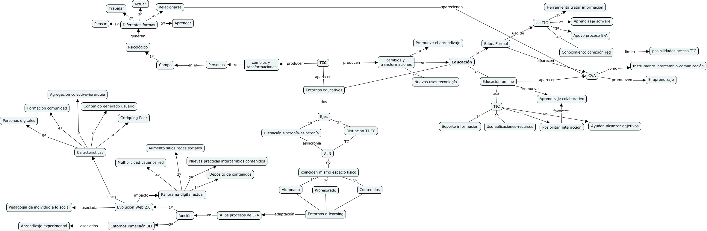 Este Cmap, tiene información relacionada con: TIC - EDUCACIÓN, Características 4ª Formación comunidad, cambios y transformaciones 1º Promueve el aprendizaje, Características 1ª Critiquing Peer, Ejes 2º Distinción TI-TC, Panorama digital actual 1º Depósito de contenidos, cambios y transformaciones 2º Nuevos usos tecnología, Educación 1º Educ. Formal, cambios y transformaciones en Educación, las TIC 1º Herramienta tratar información, Personas en el Campo, Características 2ª Contenido generado usuario, CVA promueven El aprendizaje, TIC producen cambios y tansformaciones, ALN no coinciden mismo espacio físico, Características 3ª Agregación colectivo-jerarquía, Características 5ª Personas digitales, Evolución Web 2.0 asociada Pedagogía de individuo a lo social, Entornos educativos dos Ejes, coinciden mismo espacio físico 1º Alumnado, función 1º Evolución Web 2.0