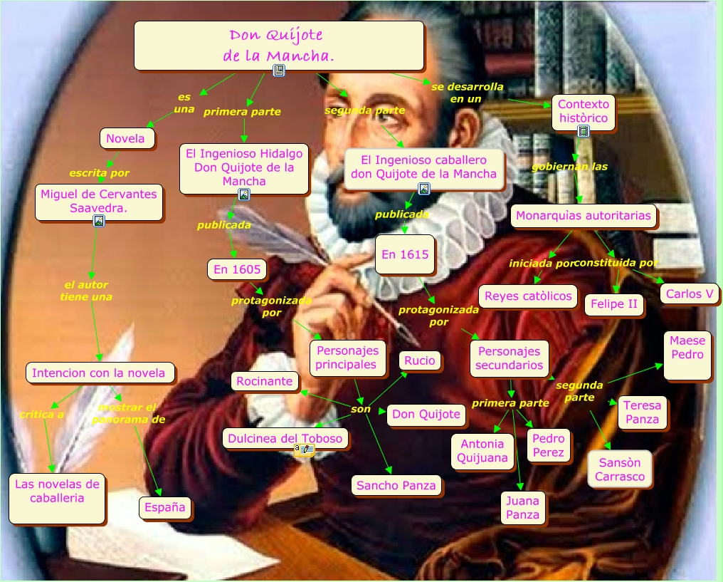 Este Cmap, tiene información relacionada con: El Quijote de la Mancha, Intencion con la novela critica a Las novelas de caballeria, Personajes secundarios segunda parte Sansòn Carrasco, Personajes secundarios primera parte Juana Panza, En 1605 protagonizada por Personajes principales, Don Quijote de la Mancha. es una Novela, Monarquìas autoritarias iniciada por Reyes catòlicos, Personajes principales son Rocinante, Monarquìas autoritarias constituida por Felipe II, Miguel de Cervantes Saavedra. el autor tiene una Intencion con la novela, Personajes secundarios segunda parte Teresa Panza, Intencion con la novela mostrar el panorama de España, El Ingenioso Hidalgo Don Quijote de la Mancha publicada En 1605, Personajes secundarios segunda parte Maese Pedro, Don Quijote de la Mancha. se desarrolla en un Contexto històrico, Don Quijote de la Mancha. primera parte El Ingenioso Hidalgo Don Quijote de la Mancha, En 1615 protagonizada por Personajes secundarios, Don Quijote de la Mancha. segunda parte El Ingenioso caballero don Quijote de la Mancha, Personajes principales son Sancho Panza, Personajes secundarios primera parte Antonia Quijuana, Personajes principales son Dulcinea del Toboso