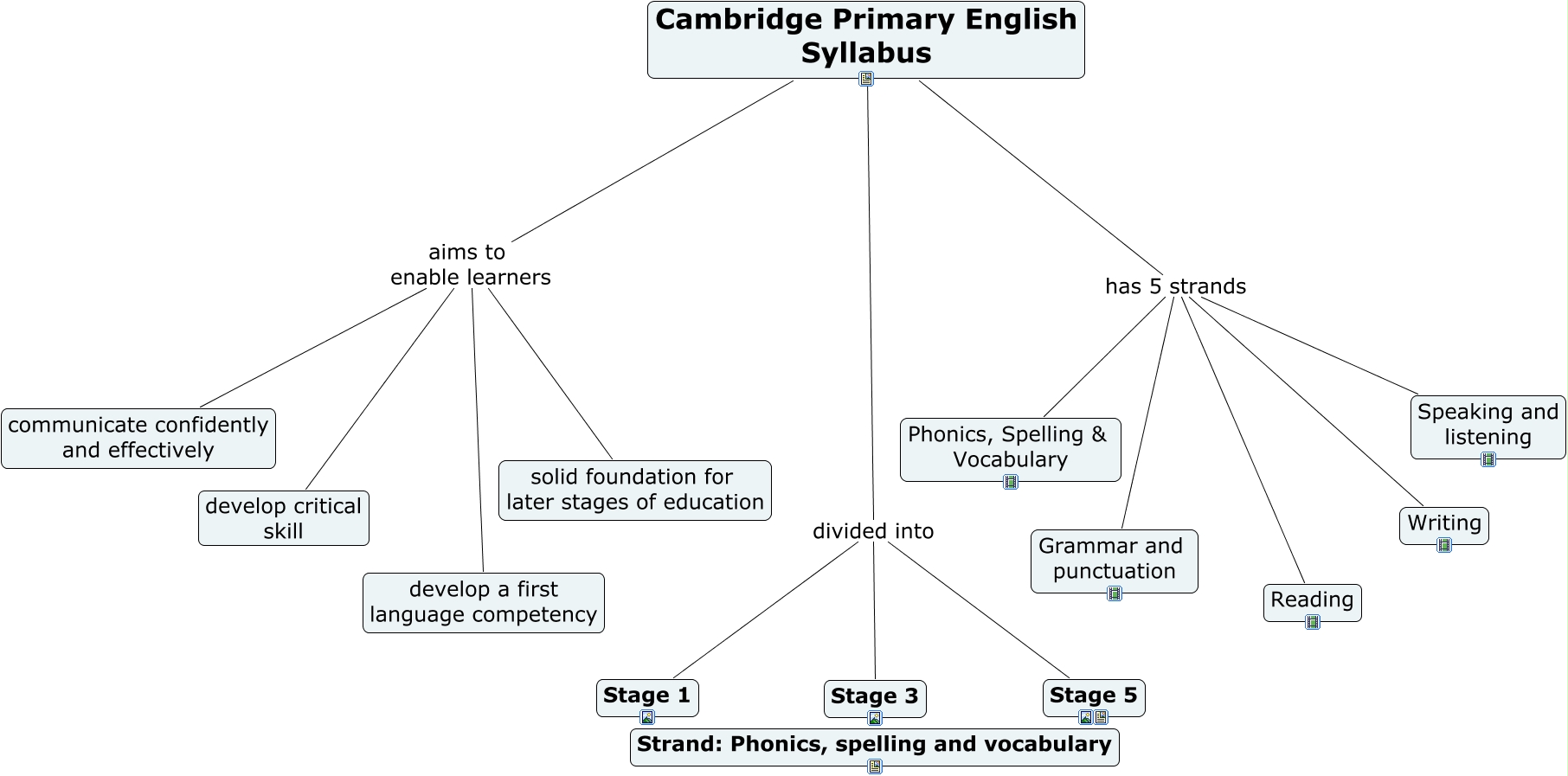 This Concept Map, created with IHMC CmapTools, has information related to: Primary English Cambridge Curriculum, Cambridge Primary English Syllabus aims to enable learners solid foundation for later stages of education, Cambridge Primary English Syllabus divided into Stage 3, Cambridge Primary English Syllabus has 5 strands Phonics, Spelling & Vocabulary, Cambridge Primary English Syllabus has 5 strands Reading, Cambridge Primary English Syllabus divided into Stage 5, Cambridge Primary English Syllabus has 5 strands Grammar and punctuation, Cambridge Primary English Syllabus aims to enable learners develop critical skill, Cambridge Primary English Syllabus divided into Stage 1, Cambridge Primary English Syllabus aims to enable learners communicate confidently and effectively, Cambridge Primary English Syllabus aims to enable learners develop a first language competency, Cambridge Primary English Syllabus has 5 strands Speaking and listening, Cambridge Primary English Syllabus has 5 strands Writing
