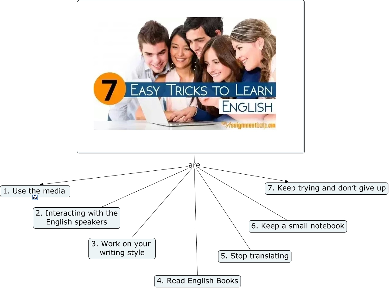 This Concept Map, created with IHMC CmapTools, has information related to: 7 easy tricks to learn English, are 1. Use the media, are 2. Interacting with the English speakers, are 7. Keep trying and don’t give up, are 4. Read English Books, are 6. Keep a small notebook, are 3. Work on your writing style, are 5. Stop translating