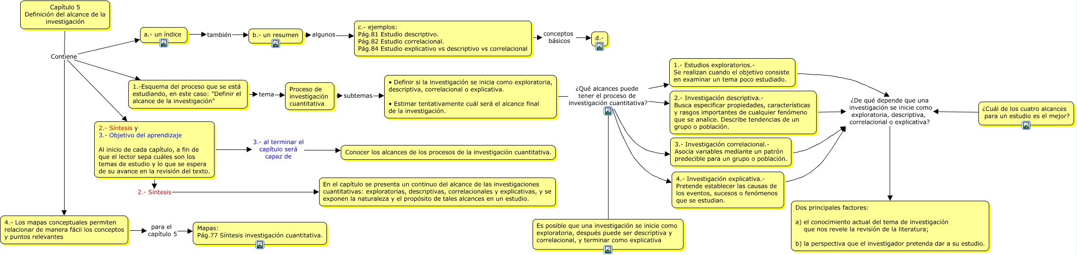 Este Cmap, tiene información relacionada con: Capítulo 5 Definición del alcance de l investigación, 1.-Esquema del proceso que se está estudiando, en este caso: "Definir el alcance de la investigación" tema Proceso de investigación cuantitativa, 3.- Investigación correlacional.- Asocia variables mediante un patrón predecible para un grupo o población. ¿De qué depende que una investigación se inicie como exploratoria, descriptiva, correlacional o explicativa? Dos principales factores: a) el conocimiento actual del tema de investigación que nos revele la revisión de la literatura; b) la perspectiva que el investigador pretenda dar a su estudio., 2.- Síntesis y 3.- Objetivo del aprendizaje Al inicio de cada capítulo, a fin de que el lector sepa cuáles son los temas de estudio y lo que se espera de su avance en la revisión del texto. 3.- al terminar el capítulo será capaz de Conocer los alcances de los procesos de la investigación cuantitativa., • Definir si la investigación se inicia como exploratoria, descriptiva, correlacional o explicativa. • Estimar tentativamente cuál será el alcance final de la investigación. ¿Qué alcances puede tener el proceso de investigación cuantitativa? 3.- Investigación correlacional.- Asocia variables mediante un patrón predecible para un grupo o población., Proceso de investigación cuantitativa subtemas • Definir si la investigación se inicia como exploratoria, descriptiva, correlacional o explicativa. • Estimar tentativamente cuál será el alcance final de la investigación., Capítulo 5 Definición del alcance de la investigación Contiene 2.- Síntesis y 3.- Objetivo del aprendizaje Al inicio de cada capítulo, a fin de que el lector sepa cuáles son los temas de estudio y lo que se espera de su avance en la revisión del texto., 2.- Síntesis y 3.- Objetivo del aprendizaje Al inicio de cada capítulo, a fin de que el lector sepa cuáles son los temas de estudio y lo que se espera de su avance en la revisión del texto. 2.- Síntesis En el capítulo se presenta un continuo del alcance de las investigaciones cuantitativas: exploratorias, descriptivas, correlacionales y explicativas, y se exponen la naturaleza y el propósito de tales alcances en un estudio., 2.- Investigación descriptiva.- Busca especificar propiedades, características y rasgos importantes de cualquier fenómeno que se analice. Describe tendencias de un grupo o población. ¿De qué depende que una investigación se inicie como exploratoria, descriptiva, correlacional o explicativa? Dos principales factores: a) el conocimiento actual del tema de investigación que nos revele la revisión de la literatura; b) la perspectiva que el investigador pretenda dar a su estudio., • Definir si la investigación se inicia como exploratoria, descriptiva, correlacional o explicativa. • Estimar tentativamente cuál será el alcance final de la investigación. ¿Qué alcances puede tener el proceso de investigación cuantitativa? 1.- Estudios exploratorios.- Se realizan cuando el objetivo consiste en examinar un tema poco estudiado., 1.- Estudios exploratorios.- Se realizan cuando el objetivo consiste en examinar un tema poco estudiado. ¿De qué depende que una investigación se inicie como exploratoria, descriptiva, correlacional o explicativa? Dos principales factores: a) el conocimiento actual del tema de investigación que nos revele la revisión de la literatura; b) la perspectiva que el investigador pretenda dar a su estudio., ¿Cuál de los cuatro alcances para un estudio es el mejor? ¿De qué depende que una investigación se inicie como exploratoria, descriptiva, correlacional o explicativa? Dos principales factores: a) el conocimiento actual del tema de investigación que nos revele la revisión de la literatura; b) la perspectiva que el investigador pretenda dar a su estudio., Capítulo 5 Definición del alcance de la investigación Contiene 1.-Esquema del proceso que se está estudiando, en este caso: "Definir el alcance de la investigación", c.- ejemplos: Pág.81 Estudio descriptivo. Pág.82 Estudio correlacional. Pág.84 Estudio explicativo vs descriptivo vs correlacional conceptos básicos d.-, 4.- Los mapas conceptuales permiten relacionar de manera fácil los conceptos y puntos relevantes para el capítulo 5 Mapas: Pág.77 Síntesis investigación cuantitativa., • Definir si la investigación se inicia como exploratoria, descriptiva, correlacional o explicativa. • Estimar tentativamente cuál será el alcance final de la investigación. ¿Qué alcances puede tener el proceso de investigación cuantitativa? 4.- Investigación explicativa.- Pretende establecer las causas de los eventos, sucesos o fenómenos que se estudian., • Definir si la investigación se inicia como exploratoria, descriptiva, correlacional o explicativa. • Estimar tentativamente cuál será el alcance final de la investigación. ¿Qué alcances puede tener el proceso de investigación cuantitativa? 2.- Investigación descriptiva.- Busca especificar propiedades, características y rasgos importantes de cualquier fenómeno que se analice. Describe tendencias de un grupo o población., Capítulo 5 Definición del alcance de la investigación Contiene 4.- Los mapas conceptuales permiten relacionar de manera fácil los conceptos y puntos relevantes, a.- un índice también b.- un resumen, Capítulo 5 Definición del alcance de la investigación Contiene a.- un índice, 4.- Investigación explicativa.- Pretende establecer las causas de los eventos, sucesos o fenómenos que se estudian. ¿De qué depende que una investigación se inicie como exploratoria, descriptiva, correlacional o explicativa? Dos principales factores: a) el conocimiento actual del tema de investigación que nos revele la revisión de la literatura; b) la perspectiva que el investigador pretenda dar a su estudio.