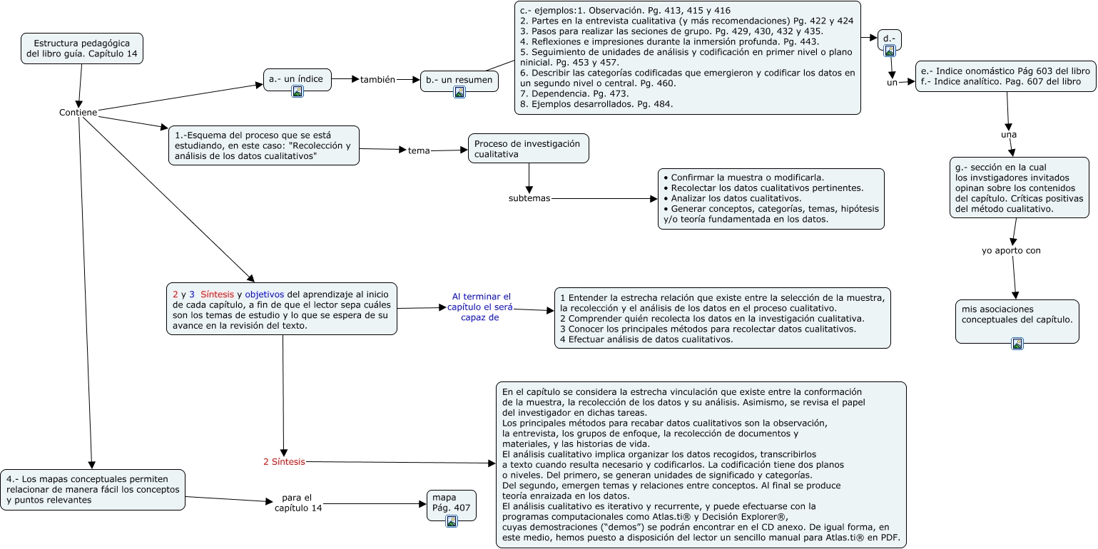 Este Cmap, tiene información relacionada con: Estructura pedagógica del capítulo 14, Proceso de investigación cualitativa subtemas • Confirmar la muestra o modificarla. • Recolectar los datos cualitativos pertinentes. • Analizar los datos cualitativos. • Generar conceptos, categorías, temas, hipótesis y/o teoría fundamentada en los datos., c.- ejemplos:1. Observación. Pg. 413, 415 y 416 2. Partes en la entrevista cualitativa (y más recomendaciones) Pg. 422 y 424 3. Pasos para realizar las seciones de grupo. Pg. 429, 430, 432 y 435. 4. Reflexiones e impresiones durante la inmersión profunda. Pg. 443. 5. Seguimiento de unidades de análisis y codificación en primer nivel o plano ninicial. Pg. 453 y 457. 6. Describir las categorías codificadas que emergieron y codificar los datos en un segundo nivel o central. Pg. 460. 7. Dependencia. Pg. 473. 8. Ejemplos desarrollados. Pg. 484. conceptos básicos d.-, 2 y 3 Síntesis y objetivos del aprendizaje al inicio de cada capítulo, a fin de que el lector sepa cuáles son los temas de estudio y lo que se espera de su avance en la revisión del texto. Al terminar el capítulo el será capaz de 1 Entender la estrecha relación que existe entre la selección de la muestra, la recolección y el análisis de los datos en el proceso cualitativo. 2 Comprender quién recolecta los datos en la investigación cualitativa. 3 Conocer los principales métodos para recolectar datos cualitativos. 4 Efectuar análisis de datos cualitativos., b.- un resumen algunos c.- ejemplos:1. Observación. Pg. 413, 415 y 416 2. Partes en la entrevista cualitativa (y más recomendaciones) Pg. 422 y 424 3. Pasos para realizar las seciones de grupo. Pg. 429, 430, 432 y 435. 4. Reflexiones e impresiones durante la inmersión profunda. Pg. 443. 5. Seguimiento de unidades de análisis y codificación en primer nivel o plano ninicial. Pg. 453 y 457. 6. Describir las categorías codificadas que emergieron y codificar los datos en un segundo nivel o central. Pg. 460. 7. Dependencia. Pg. 473. 8. Ejemplos desarrollados. Pg. 484., Estructura pedagógica del libro guía. Capítulo 14 Contiene 4.- Los mapas conceptuales permiten relacionar de manera fácil los conceptos y puntos relevantes, Estructura pedagógica del libro guía. Capítulo 14 Contiene 1.-Esquema del proceso que se está estudiando, en este caso: "Recolección y análisis de los datos cualitativos", a.- un índice también b.- un resumen, Estructura pedagógica del libro guía. Capítulo 14 Contiene 2 y 3 Síntesis y objetivos del aprendizaje al inicio de cada capítulo, a fin de que el lector sepa cuáles son los temas de estudio y lo que se espera de su avance en la revisión del texto., 1.-Esquema del proceso que se está estudiando, en este caso: "Recolección y análisis de los datos cualitativos" tema Proceso de investigación cualitativa, g.- sección en la cual los invstigadores invitados opinan sobre los contenidos del capítulo. Críticas positivas del método cualitativo. yo aporto con mis asociaciones conceptuales del capítulo., d.- un e.- Indice onomástico Pág 603 del libro f.- Indice analítico. Pag. 607 del libro, 4.- Los mapas conceptuales permiten relacionar de manera fácil los conceptos y puntos relevantes para el capítulo 14 mapa Pág. 407, Estructura pedagógica del libro guía. Capítulo 14 Contiene a.- un índice, 2 y 3 Síntesis y objetivos del aprendizaje al inicio de cada capítulo, a fin de que el lector sepa cuáles son los temas de estudio y lo que se espera de su avance en la revisión del texto. 2 Síntesis En el capítulo se considera la estrecha vinculación que existe entre la conformación de la muestra, la recolección de los datos y su análisis. Asimismo, se revisa el papel del investigador en dichas tareas. Los principales métodos para recabar datos cualitativos son la observación, la entrevista, los grupos de enfoque, la recolección de documentos y materiales, y las historias de vida. El análisis cualitativo implica organizar los datos recogidos, transcribirlos a texto cuando resulta necesario y codificarlos. La codificación tiene dos planos o niveles. Del primero, se generan unidades de significado y categorías. Del segundo, emergen temas y relaciones entre conceptos. Al final se produce teoría enraizada en los datos. El análisis cualitativo es iterativo y recurrente, y puede efectuarse con la programas computacionales como Atlas.ti® y Decisión Explorer®, cuyas demostraciones (“demos”) se podrán encontrar en el CD anexo. De igual forma, en este medio, hemos puesto a disposición del lector un sencillo manual para Atlas.ti® en PDF., e.- Indice onomástico Pág 603 del libro f.- Indice analítico. Pag. 607 del libro una g.- sección en la cual los invstigadores invitados opinan sobre los contenidos del capítulo. Críticas positivas del método cualitativo.