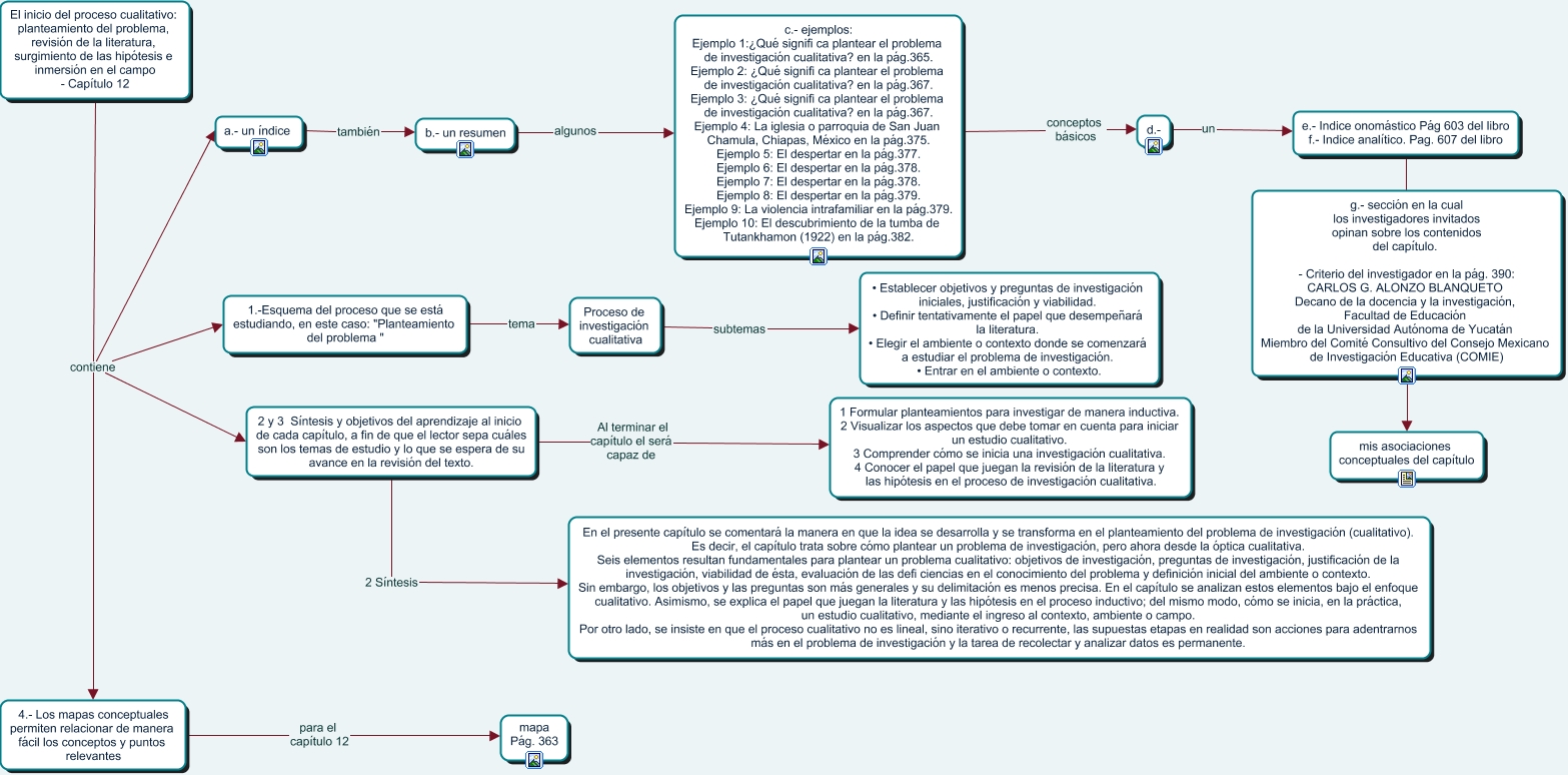 Este Cmap, tiene información relacionada con: Estructura Pedagógica Cap. 12, El inicio del proceso cualitativo: planteamiento del problema, revisión de la literatura, surgimiento de las hipótesis e inmersión en el campo - Capítulo 12 contiene 1.-Esquema del proceso que se está estudiando, en este caso: "Planteamiento del problema ", El inicio del proceso cualitativo: planteamiento del problema, revisión de la literatura, surgimiento de las hipótesis e inmersión en el campo - Capítulo 12 contiene a.- un índice, 2 y 3 Síntesis y objetivos del aprendizaje al inicio de cada capítulo, a fin de que el lector sepa cuáles son los temas de estudio y lo que se espera de su avance en la revisión del texto. 2 Síntesis En el presente capítulo se comentará la manera en que la idea se desarrolla y se transforma en el planteamiento del problema de investigación (cualitativo). Es decir, el capítulo trata sobre cómo plantear un problema de investigación, pero ahora desde la óptica cualitativa. Seis elementos resultan fundamentales para plantear un problema cualitativo: objetivos de investigación, preguntas de investigación, justificación de la investigación, viabilidad de ésta, evaluación de las defi ciencias en el conocimiento del problema y definición inicial del ambiente o contexto. Sin embargo, los objetivos y las preguntas son más generales y su delimitación es menos precisa. En el capítulo se analizan estos elementos bajo el enfoque cualitativo. Asimismo, se explica el papel que juegan la literatura y las hipótesis en el proceso inductivo; del mismo modo, cómo se inicia, en la práctica, un estudio cualitativo, mediante el ingreso al contexto, ambiente o campo. Por otro lado, se insiste en que el proceso cualitativo no es lineal, sino iterativo o recurrente, las supuestas etapas en realidad son acciones para adentrarnos más en el problema de investigación y la tarea de recolectar y analizar datos es permanente., Proceso de investigación cualitativa subtemas • Establecer objetivos y preguntas de investigación iniciales, justificación y viabilidad. • Definir tentativamente el papel que desempeñará la literatura. • Elegir el ambiente o contexto donde se comenzará a estudiar el problema de investigación. • Entrar en el ambiente o contexto., a.- un índice también b.- un resumen, 1.-Esquema del proceso que se está estudiando, en este caso: "Planteamiento del problema " tema Proceso de investigación cualitativa, El inicio del proceso cualitativo: planteamiento del problema, revisión de la literatura, surgimiento de las hipótesis e inmersión en el campo - Capítulo 12 contiene 2 y 3 Síntesis y objetivos del aprendizaje al inicio de cada capítulo, a fin de que el lector sepa cuáles son los temas de estudio y lo que se espera de su avance en la revisión del texto., 2 y 3 Síntesis y objetivos del aprendizaje al inicio de cada capítulo, a fin de que el lector sepa cuáles son los temas de estudio y lo que se espera de su avance en la revisión del texto. Al terminar el capítulo el será capaz de 1 Formular planteamientos para investigar de manera inductiva. 2 Visualizar los aspectos que debe tomar en cuenta para iniciar un estudio cualitativo. 3 Comprender cómo se inicia una investigación cualitativa. 4 Conocer el papel que juegan la revisión de la literatura y las hipótesis en el proceso de investigación cualitativa., g.- sección en la cual los investigadores invitados opinan sobre los contenidos del capítulo. - Criterio del investigador en la pág. 390: CARLOS G. ALONZO BLANQUETO Decano de la docencia y la investigación, Facultad de Educación de la Universidad Autónoma de Yucatán Miembro del Comité Consultivo del Consejo Mexicano de Investigación Educativa (COMIE) ???? mis asociaciones conceptuales del capítulo, d.- un e.- Indice onomástico Pág 603 del libro f.- Indice analítico. Pag. 607 del libro, b.- un resumen algunos c.- ejemplos: Ejemplo 1:¿Qué signifi ca plantear el problema de investigación cualitativa? en la pág.365. Ejemplo 2: ¿Qué signifi ca plantear el problema de investigación cualitativa? en la pág.367. Ejemplo 3: ¿Qué signifi ca plantear el problema de investigación cualitativa? en la pág.367. Ejemplo 4: La iglesia o parroquia de San Juan Chamula, Chiapas, México en la pág.375. Ejemplo 5: El despertar en la pág.377. Ejemplo 6: El despertar en la pág.378. Ejemplo 7: El despertar en la pág.378. Ejemplo 8: El despertar en la pág.379. Ejemplo 9: La violencia intrafamiliar en la pág.379. Ejemplo 10: El descubrimiento de la tumba de Tutankhamon (1922) en la pág.382., 4.- Los mapas conceptuales permiten relacionar de manera fácil los conceptos y puntos relevantes para el capítulo 12 mapa Pág. 363, El inicio del proceso cualitativo: planteamiento del problema, revisión de la literatura, surgimiento de las hipótesis e inmersión en el campo - Capítulo 12 contiene 4.- Los mapas conceptuales permiten relacionar de manera fácil los conceptos y puntos relevantes, e.- Indice onomástico Pág 603 del libro f.- Indice analítico. Pag. 607 del libro ???? g.- sección en la cual los investigadores invitados opinan sobre los contenidos del capítulo. - Criterio del investigador en la pág. 390: CARLOS G. ALONZO BLANQUETO Decano de la docencia y la investigación, Facultad de Educación de la Universidad Autónoma de Yucatán Miembro del Comité Consultivo del Consejo Mexicano de Investigación Educativa (COMIE), c.- ejemplos: Ejemplo 1:¿Qué signifi ca plantear el problema de investigación cualitativa? en la pág.365. Ejemplo 2: ¿Qué signifi ca plantear el problema de investigación cualitativa? en la pág.367. Ejemplo 3: ¿Qué signifi ca plantear el problema de investigación cualitativa? en la pág.367. Ejemplo 4: La iglesia o parroquia de San Juan Chamula, Chiapas, México en la pág.375. Ejemplo 5: El despertar en la pág.377. Ejemplo 6: El despertar en la pág.378. Ejemplo 7: El despertar en la
