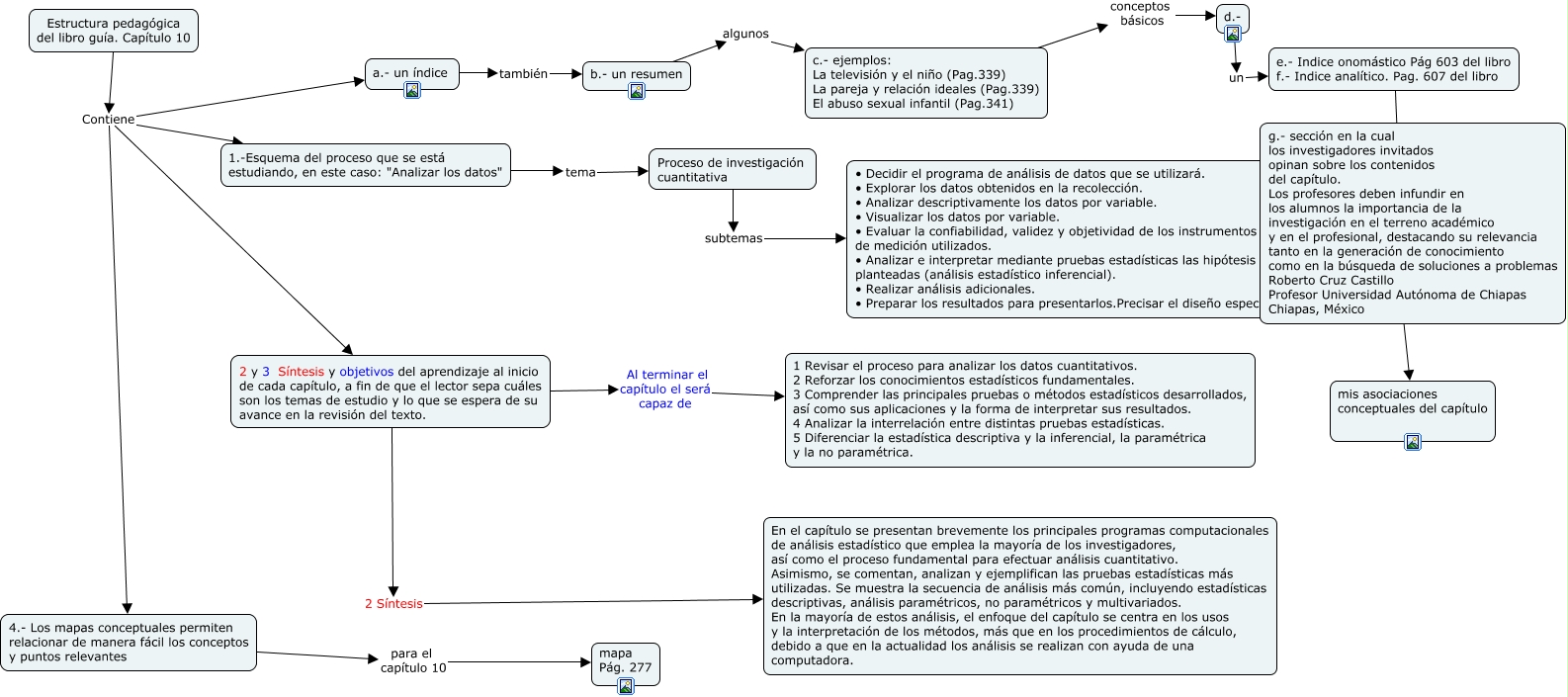 Este Cmap, tiene información relacionada con: Estructura pedagógica del capítulo 10, Proceso de investigación cuantitativa subtemas • Decidir el programa de análisis de datos que se utilizará. • Explorar los datos obtenidos en la recolección. • Analizar descriptivamente los datos por variable. • Visualizar los datos por variable. • Evaluar la confiabilidad, validez y objetividad de los instrumentos de medición utilizados. • Analizar e interpretar mediante pruebas estadísticas las hipótesis planteadas (análisis estadístico inferencial). • Realizar análisis adicionales. • Preparar los resultados para presentarlos.Precisar el diseño específico, c.- ejemplos: La televisión y el niño (Pag.339) La pareja y relación ideales (Pag.339) El abuso sexual infantil (Pag.341) conceptos básicos d.-, 2 y 3 Síntesis y objetivos del aprendizaje al inicio de cada capítulo, a fin de que el lector sepa cuáles son los temas de estudio y lo que se espera de su avance en la revisión del texto. Al terminar el capítulo el será capaz de 1 Revisar el proceso para analizar los datos cuantitativos. 2 Reforzar los conocimientos estadísticos fundamentales. 3 Comprender las principales pruebas o métodos estadísticos desarrollados, así como sus aplicaciones y la forma de interpretar sus resultados. 4 Analizar la interrelación entre distintas pruebas estadísticas. 5 Diferenciar la estadística descriptiva y la inferencial, la paramétrica y la no paramétrica., b.- un resumen algunos c.- ejemplos: La televisión y el niño (Pag.339) La pareja y relación ideales (Pag.339) El abuso sexual infantil (Pag.341), Estructura pedagógica del libro guía. Capítulo 10 Contiene 4.- Los mapas conceptuales permiten relacionar de manera fácil los conceptos y puntos relevantes, Estructura pedagógica del libro guía. Capítulo 10 Contiene 1.-Esquema del proceso que se está estudiando, en este caso: "Analizar los datos", a.- un índice también b.- un resumen, Estructura pedagógica del libro guía. Capítulo 10 Contiene 2 y 3 Síntesis y objetivos del aprendizaje al inicio de cada capítulo, a fin de que el lector sepa cuáles son los temas de estudio y lo que se espera de su avance en la revisión del texto., 1.-Esquema del proceso que se está estudiando, en este caso: "Analizar los datos" tema Proceso de investigación cuantitativa, g.- sección en la cual los investigadores invitados opinan sobre los contenidos del capítulo. Los profesores deben infundir en los alumnos la importancia de la investigación en el terreno académico y en el profesional, destacando su relevancia tanto en la generación de conocimiento como en la búsqueda de soluciones a problemas Roberto Cruz Castillo Profesor Universidad Autónoma de Chiapas Chiapas, México yo aporto con mis asociaciones conceptuales del capítulo, d.- un e.- Indice onomástico Pág 603 del libro f.- Indice analítico. Pag. 607 del libro, 4.- Los mapas conceptuales permiten relacionar de manera fácil los conceptos y puntos relevantes para el capítulo 10 mapa Pág. 277, Estructura pedagógica del libro guía. Capítulo 10 Contiene a.- un índice, 2 y 3 Síntesis y objetivos del aprendizaje al inicio de cada capítulo, a fin de que el lector sepa cuáles son los temas de estudio y lo que se espera de su avance en la revisión del texto. 2 Síntesis En el capítulo se presentan brevemente los principales programas computacionales de análisis estadístico que emplea la mayoría de los investigadores, así como el proceso fundamental para efectuar análisis cuantitativo. Asimismo, se comentan, analizan y ejemplifican las pruebas estadísticas más utilizadas. Se muestra la secuencia de análisis más común, incluyendo estadísticas descriptivas, análisis paramétricos, no paramétricos y multivariados. En la mayoría de estos análisis, el enfoque del capítulo se centra en los usos y la interpretación de los métodos, más que en los procedimientos de cálculo, debido a que en la actualidad los análisis se realizan con ayuda de una computadora., e.- Indice onomástico Pág 603 del libro f.- Indice analítico. Pag. 607 del libro una g.- sección en la cual los investigadores invitados opinan sobre los contenidos del capítulo. Los profesores deben infundir en los alumnos la importancia de la investigación en el terreno académico y en el profesional, destacando su relevancia tanto en la generación de conocimiento como en la búsqueda de soluciones a problemas Roberto Cruz Castillo Profesor Universidad Autónoma de Chiapas Chiapas, México