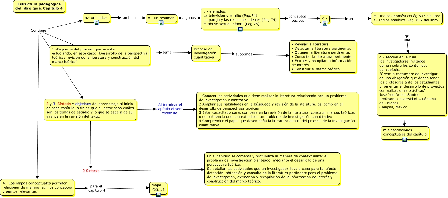 Este Cmap, tiene información relacionada con: Estructura pedagógica capítulo 4, Estructura pedagógica del libro guía. Capítulo 4 Contiene a.- un índice, 2 y 3 Síntesis y objetivos del aprendizaje al inicio de cada capítulo, a fin de que el lector sepa cuáles son los temas de estudio y lo que se espera de su avance en la revisión del texto. 2 Síntesis En el capítulo se comenta y profundiza la manera de contextualizar el problema de investigación planteado, mediante el desarrollo de una perspectiva teórica. Se detallan las actividades que un investigador lleva a cabo para tal efecto detección, obtención y consulta de la literatura pertinente para el problema de investigación, extracción y recopilación de la información de interés y construcción del marco teórico., Estructura pedagógica del libro guía. Capítulo 4 Contiene 2 y 3 Síntesis y objetivos del aprendizaje al inicio de cada capítulo, a fin de que el lector sepa cuáles son los temas de estudio y lo que se espera de su avance en la revisión del texto., g.- sección en la cual los invstigadores invitados opinan sobre los contenidos del capítulo. "Crear la costumbre de investigar es una obligación que deben tener los profesores ante los estudiantes y fomentar el desarrollo de proyectos con aplicaciones prácticas" José Yee De los Santos Profesora Universidad Autónoma de Chiapas Chiapas, México. yo aporto con mis asociaciones conceptuales del capítulo, a.- un índice tambien b.- un resumen, e.- Indice onomásticoPág 603 del libro f.- Indice analítico. Pag. 607 del libro una g.- sección en la cual los invstigadores invitados opinan sobre los contenidos del capítulo. "Crear la costumbre de investigar es una obligación que deben tener los profesores ante los estudiantes y fomentar el desarrollo de proyectos con aplicaciones prácticas" José Yee De los Santos Profesora Universidad Autónoma de Chiapas Chiapas, México., 2 y 3 Síntesis y objetivos del aprendizaje al inicio de cada capítulo, a fin de que el lector sepa cuáles son los temas de estudio y lo que se espera de su avance en la revisión del texto. Al terminar el capítulo el será capaz de 1 Conocer las actividades que debe realizar la literatura relacionada con un problema de investigación cuantitativa 2 Ampliar sus habilidades en la búsqueda y revisión de la literatura, así como en el desarrollo de perspectivas teóricas 3 Estar capacitado para, con base en la revisión de la literatura, construir marcos teóricos o de referencia que contextualicen un problema de investigación cuantitativo 4 Comprender el papel que desempeña la literatura dentro del proceso de la investigación cuantitativa., b.- un resumen algunos c.- ejemplos: La televisión y el niño (Pag.74) La pareja y las relaciones ideales (Pag.74) El abuso sexual infantil (Pag.75), 4.- Los mapas conceptuales permiten relacionar de manera fácil los conceptos y puntos relevantes para el capítulo 4 mapa Pág. 51, Estructura pedagógica del libro guía. Capítulo 4 Contiene 4.- Los mapas conceptuales permiten relacionar de manera fácil los conceptos y puntos relevantes, Estructura pedagógica del libro guía. Capítulo 4 Contiene 1.-Esquema del proceso que se está estudiando, en este caso: "Desarrollo de la perspectiva teórica: revisión de la literatura y construcción del marco teórico", c.- ejemplos: La televisión y el niño (Pag.74) La pareja y las relaciones ideales (Pag.74) El abuso sexual infantil (Pag.75) conceptos básicos d.-, d.- un e.- Indice onomásticoPág 603 del libro f.- Indice analítico. Pag. 607 del libro, Proceso de investigación cuantitativa subtemas • Revisar la literatura • Detectar la literatura pertinente. • Obtener la literatura pertinente. • Consultar la literatura pertinente.. • Extraer y recopilar la información de interés. • Construir el marco teórico., 1.-Esquema del proceso que se está estudiando, en este caso: "Desarrollo de la perspectiva teórica: revisión de la literatura y construcción del marco teórico" tema Proceso de investigación cuantitativa