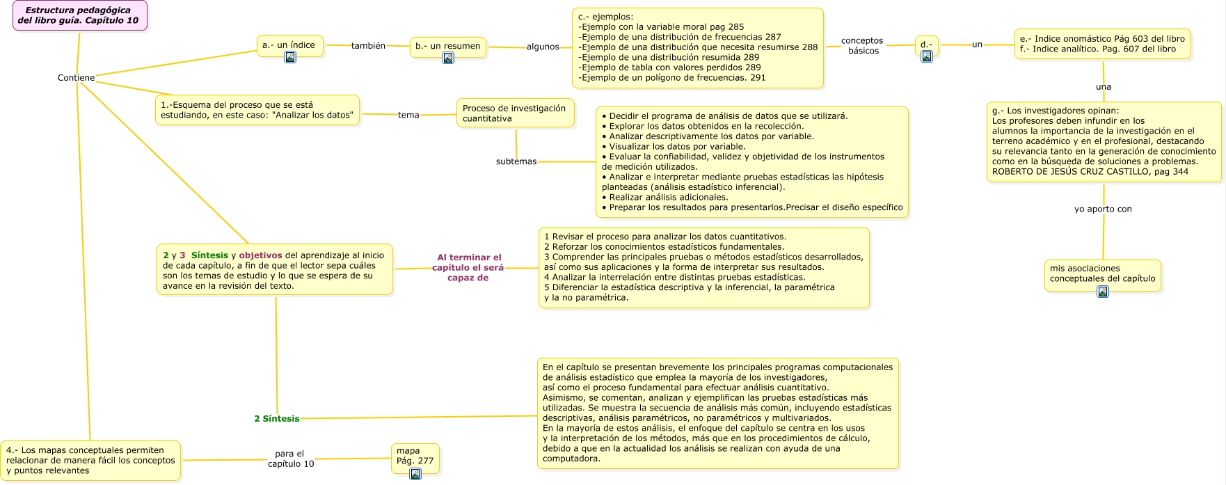 Este Cmap, tiene información relacionada con: Cap 10-Análisis de datos cuantitativos, Proceso de investigación cuantitativa subtemas • Decidir el programa de análisis de datos que se utilizará. • Explorar los datos obtenidos en la recolección. • Analizar descriptivamente los datos por variable. • Visualizar los datos por variable. • Evaluar la confiabilidad, validez y objetividad de los instrumentos de medición utilizados. • Analizar e interpretar mediante pruebas estadísticas las hipótesis planteadas (análisis estadístico inferencial). • Realizar análisis adicionales. • Preparar los resultados para presentarlos.Precisar el diseño específico, c.- ejemplos: -Ejemplo con la variable moral pag 285 -Ejemplo de una distribución de frecuencias 287 -Ejemplo de una distribución que necesita resumirse 288 -Ejemplo de una distribución resumida 289 -Ejemplo de tabla con valores perdidos 289 -Ejemplo de un polígono de frecuencias. 291 conceptos básicos d.-, 2 y 3 Síntesis y objetivos del aprendizaje al inicio de cada capítulo, a fin de que el lector sepa cuáles son los temas de estudio y lo que se espera de su avance en la revisión del texto. Al terminar el capítulo el será capaz de 1 Revisar el proceso para analizar los datos cuantitativos. 2 Reforzar los conocimientos estadísticos fundamentales. 3 Comprender las principales pruebas o métodos estadísticos desarrollados, así como sus aplicaciones y la forma de interpretar sus resultados. 4 Analizar la interrelación entre distintas pruebas estadísticas. 5 Diferenciar la estadística descriptiva y la inferencial, la paramétrica y la no paramétrica., b.- un resumen algunos c.- ejemplos: -Ejemplo con la variable moral pag 285 -Ejemplo de una distribución de frecuencias 287 -Ejemplo de una distribución que necesita resumirse 288 -Ejemplo de una distribución resumida 289 -Ejemplo de tabla con valores perdidos 289 -Ejemplo de un polígono de frecuencias. 291, Estructura pedagógica del libro guía. Capítulo 10 Contiene 4.- Los mapas conceptuales permiten relacionar de manera fácil los conceptos y puntos relevantes, Estructura pedagógica del libro guía. Capítulo 10 Contiene 1.-Esquema del proceso que se está estudiando, en este caso: "Analizar los datos", a.- un índice también b.- un resumen, Estructura pedagógica del libro guía. Capítulo 10 Contiene 2 y 3 Síntesis y objetivos del aprendizaje al inicio de cada capítulo, a fin de que el lector sepa cuáles son los temas de estudio y lo que se espera de su avance en la revisión del texto., 1.-Esquema del proceso que se está estudiando, en este caso: "Analizar los datos" tema Proceso de investigación cuantitativa, g.- Los investigadores opinan: Los profesores deben infundir en los alumnos la importancia de la investigación en el terreno académico y en el profesional, destacando su relevancia tanto en la generación de conocimiento como en la búsqueda de soluciones a problemas. ROBERTO DE JESÚS CRUZ CASTILLO, pag 344 yo aporto con mis asociaciones conceptuales del capítulo, d.- un e.- Indice onomástico Pág 603 del libro f.- Indice analítico. Pag. 607 del libro, 4.- Los mapas conceptuales permiten relacionar de manera fácil los conceptos y puntos relevantes para el capítulo 10 mapa Pág. 277, Estructura pedagógica del libro guía. Capítulo 10 Contiene a.- un índice, 2 y 3 Síntesis y objetivos del aprendizaje al inicio de cada capítulo, a fin de que el lector sepa cuáles son los temas de estudio y lo que se espera de su avance en la revisión del texto. 2 Síntesis En el capítulo se presentan brevemente los principales programas computacionales de análisis estadístico que emplea la mayoría de los investigadores, así como el proceso fundamental para efectuar análisis cuantitativo. Asimismo, se comentan, analizan y ejemplifican las pruebas estadísticas más utilizadas. Se muestra la secuencia de análisis más común, incluyendo estadísticas descriptivas, análisis paramétricos, no paramétricos y multivariados. En la mayoría de estos análisis, el enfoque del capítulo se centra en los usos y la interpretación de los métodos, más que en los procedimientos de cálculo, debido a que en la actualidad los análisis se realizan con ayuda de una computadora., e.- Indice onomástico Pág 603 del libro f.- Indice analítico. Pag. 607 del libro una g.- Los investigadores opinan: Los profesores deben infundir en los alumnos la importancia de la investigación en el terreno académico y en el profesional, destacando su relevancia tanto en la generación de conocimiento como en la búsqueda de soluciones a problemas. ROBERTO DE JESÚS CRUZ CASTILLO, pag 344