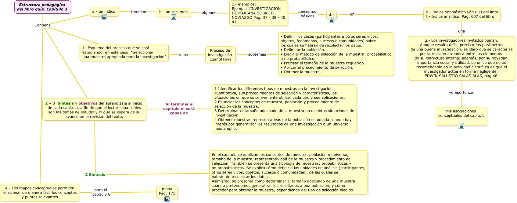 Este Cmap, tiene información relacionada con: Cap 3- Planteamiento del problema cuantitativo, a.- un índice también b.- un resumen, d.- un e.- Indice onomástico Pág 603 del libro f.- Indice analítico. Pag. 607 del libro, 2 y 3 Síntesis y objetivos del aprendizaje al inicio de cada capítulo, a fin de que el lector sepa cuáles son los temas de estudio y lo que se espera de su avance en la revisión del texto. Al terminar el capítulo el será capaz de 1 Identificar los diferentes tipos de muestras en la investigación cuantitativa, sus procedimientos de selección y características, las situaciones en que es conveniente utilizar cada uno y sus aplicaciones. 2 Enunciar los conceptos de muestra, población y procedimiento de selección de la muestra. 3 Determinar el tamaño adecuado de la muestra en distintas situaciones de investigación. 4 Obtener muestras representativas de la población estudiada cuando hay interés por generalizar los resultados de una investigación a un universo más amplio., 4.- Los mapas conceptuales permiten relacionar de manera fácil los conceptos y puntos relevantes para el capítulo 8 mapa Pág. 171, Estructura pedagógica del libro guía. Capítulo 3 Contiene 2 y 3 Síntesis y objetivos del aprendizaje al inicio de cada capítulo, a fin de que el lector sepa cuáles son los temas de estudio y lo que se espera de su avance en la revisión del texto., e.- Indice onomástico Pág 603 del libro f.- Indice analítico. Pag. 607 del libro una g.- Los investigadores invitados opinan: Aunque resulta difícil precisar los parámetros de una buena investigación, es claro que se caracteriza por la relación armónica entre los elementos de su estructura interna; además, por su novedad, importancia social y utilidad. Lo único que no es recomendable en la actividad científi ca es que el investigador actúe en forma negligente. EDWIN SALUSTIO SALAS BLAS, pag 48, b.- un resumen algunos c.- ejemplos: Ejemplo 1INVESTIGACIÓN DE MARIANA SOBRE EL NOVIAZGO Pag. 37 - 38 - 40 41, c.- ejemplos: Ejemplo 1INVESTIGACIÓN DE MARIANA SOBRE EL NOVIAZGO Pag. 37 - 38 - 40 41 conceptos básicos d.-, Estructura pedagógica del libro guía. Capítulo 3 Contiene a.- un índice, Estructura pedagógica del libro guía. Capítulo 3 Contiene 1.-Esquema del proceso que se está estudiando, en este caso: "Seleccionar una muestra apropiada para la investigación", 2 y 3 Síntesis y objetivos del aprendizaje al inicio de cada capítulo, a fin de que el lector sepa cuáles son los temas de estudio y lo que se espera de su avance en la revisión del texto. 2 Síntesis En el capítulo se analizan los conceptos de muestra, población o universo, tamaño de la muestra, representatividad de la muestra y procedimiento de selección. También se presenta una tipología de muestras: probabilísticas y no probabilísticas. Se explica cómo definir a las unidades de análisis (participantes, otros seres vivos, objetos, sucesos o comunidades), de las cuales se habrán de recolectar los datos. Asimismo, se presenta cómo determinar el tamaño adecuado de una muestra cuando pretendemos generalizar los resultados a una población, y cómo proceder para obtener la muestra, dependiendo del tipo de selección elegido., Estructura pedagógica del libro guía. Capítulo 3 Contiene 4.- Los mapas conceptuales permiten relacionar de manera fácil los conceptos y puntos relevantes, g.- Los investigadores invitados opinan: Aunque resulta difícil precisar los parámetros de una buena investigación, es claro que se caracteriza por la relación armónica entre los elementos de su estructura interna; además, por su novedad, importancia social y utilidad. Lo único que no es recomendable en la actividad científi ca es que el investigador actúe en forma negligente. EDWIN SALUSTIO SALAS BLAS, pag 48 yo aporto con Mis asociaciones conceptuales del capítulo, Proceso de investigación cuantitativa subtemas • Definir los casos (participantes u otros seres vivos, objetos, fenómenos, sucesos o comunidades) sobre los cuales se habrán de recolectar los datos. • Delimitar la población. • Elegir el método de selección de la muestra: probabilístico o no probabilístico. • Precisar el tamaño de la muestra requerido. • Aplicar el procedimiento de selección. • Obtener la muestra., 1.-Esquema del proceso que se está estudiando, en este caso: "Seleccionar una muestra apropiada para la investigación" tema Proceso de investigación cuantitativa