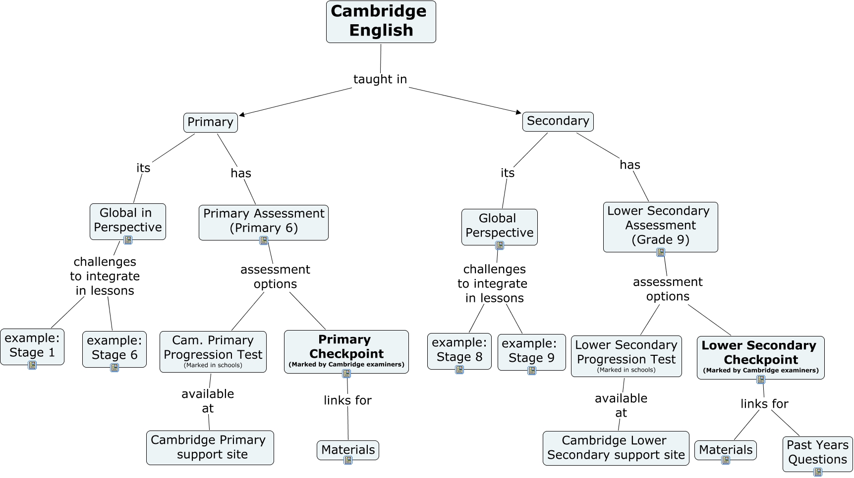 This Concept Map, created with IHMC CmapTools, has information related to: Cambridge Pri & Sec English Pesentation, Global in Perspective challenges to integrate in lessons example: Stage 1, Lower Secondary Checkpoint (Marked by Cambridge examiners) links for Materials, Primary its Global in Perspective, Cambridge English taught in Primary, Lower Secondary Progression Test (Marked in schools) available at Cambridge Lower Secondary support site, Lower Secondary Assessment (Grade 9) assessment options Lower Secondary Progression Test (Marked in schools), Secondary its Global Perspective, Secondary has Lower Secondary Assessment (Grade 9), Cambridge English taught in Secondary, Primary Assessment (Primary 6) assessment options Primary Checkpoint (Marked by Cambridge examiners), Global Perspective challenges to integrate in lessons example: Stage 9, Primary Assessment (Primary 6) assessment options Cam. Primary Progression Test (Marked in schools), Cam. Primary Progression Test (Marked in schools) available at Cambridge Primary support site, Primary Checkpoint (Marked by Cambridge examiners) links for Materials, Global Perspective challenges to integrate in lessons example: Stage 8, Global in Perspective challenges to integrate in lessons example: Stage 6, Primary has Primary Assessment (Primary 6), Lower Secondary Checkpoint (Marked by Cambridge examiners) links for Past Years Questions, Lower Secondary Assessment (Grade 9) assessment options Lower Secondary Checkpoint (Marked by Cambridge examiners)