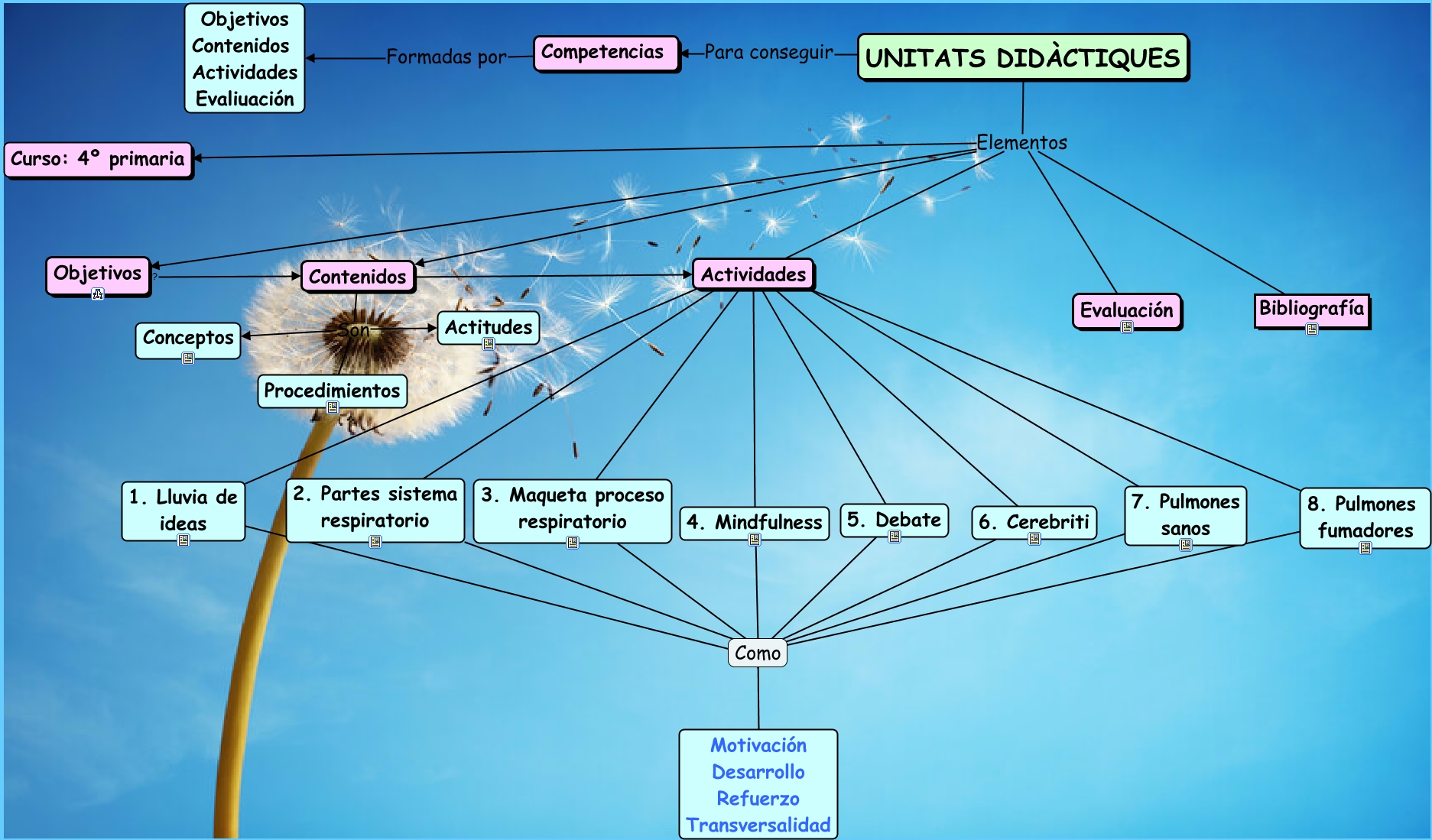 Este Cmap, tiene información relacionada con: Unidad didáctica, Competencias Formadas por Objetivos Contenidos Actividades Evaliuación, 3. Maqueta proceso respiratorio ???? Como, Como ???? Motivación Desarrollo Refuerzo Transversalidad, Contenidos ???? Actividades, 5. Debate ???? Como, Actividades ???? 2. Partes sistema respiratorio, UNITATS DIDÀCTIQUES Elementos Curso: 4º primaria, UNITATS DIDÀCTIQUES Elementos Bibliografía, Actividades ???? 4. Mindfulness, 8. Pulmones fumadores ???? Como, Actividades ???? 6. Cerebriti, Actividades ???? 5. Debate, UNITATS DIDÀCTIQUES Elementos Objetivos, Objetivos ???? Contenidos, Actividades ???? 8. Pulmones fumadores, Actividades ???? 3. Maqueta proceso respiratorio, UNITATS DIDÀCTIQUES Elementos Evaluación, Contenidos Son Actitudes, 2. Partes sistema respiratorio ???? Como, Actividades ???? 7. Pulmones sanos