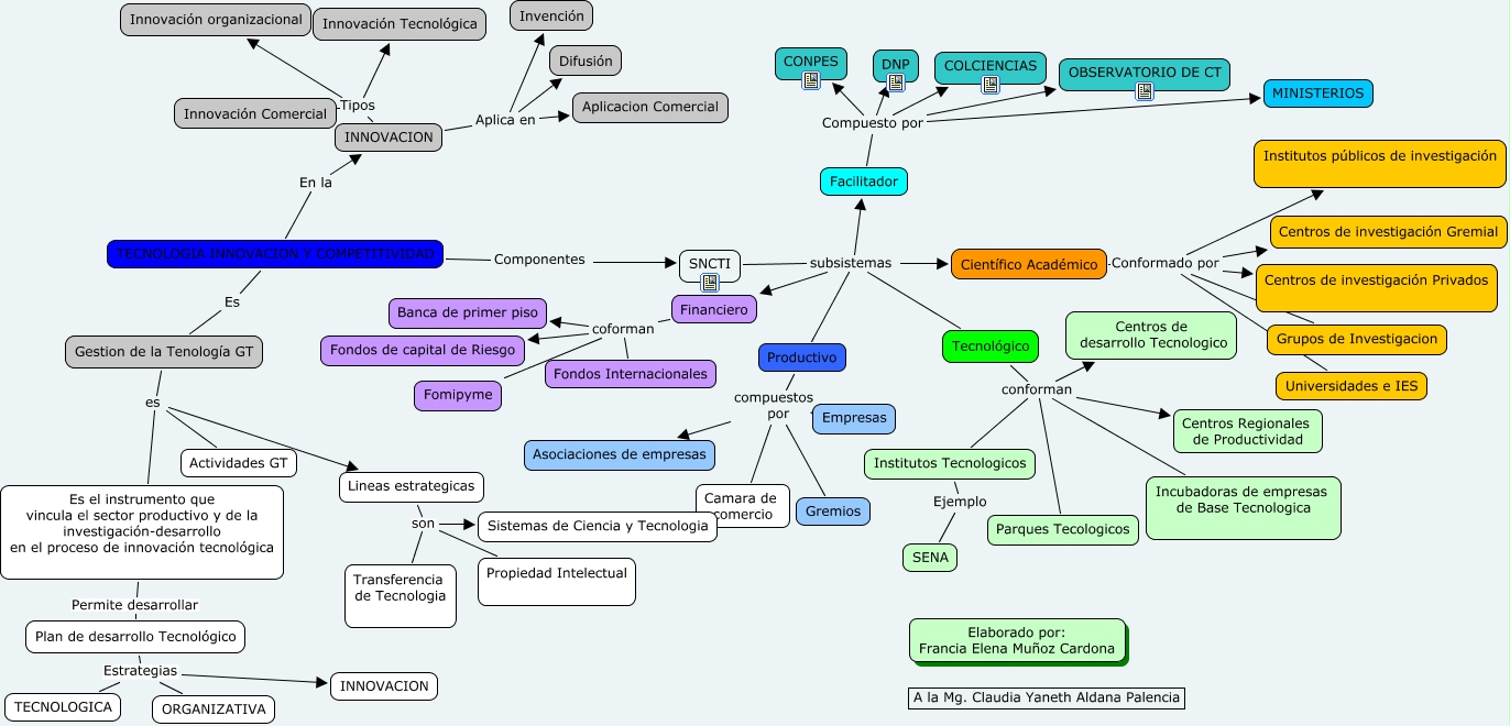 Este Cmap, tiene información relacionada con: Tecnologia e Investigación, INNOVACION Tipos Innovación Comercial, Facilitador Compuesto por MINISTERIOS, Facilitador Compuesto por OBSERVATORIO DE CT, INNOVACION Aplica en Difusión, Es el instrumento que vincula el sector productivo y de la investigación-desarrollo en el proceso de innovación tecnológica Permite desarrollar Plan de desarrollo Tecnológico, Financiero coforman Banca de primer piso, INNOVACION Aplica en Invención, Financiero coforman Fondos de capital de Riesgo, Científico Académico Conformado por Institutos públicos de investigación, Plan de desarrollo Tecnológico Estrategias INNOVACION, Facilitador Compuesto por DNP, SNCTI subsistemas Financiero, Gestion de la Tenología GT es Actividades GT, Lineas estrategicas son Propiedad Intelectual, Científico Académico Conformado por Grupos de Investigacion, Tecnológico conforman Parques Tecologicos, Facilitador Compuesto por CONPES, SNCTI subsistemas Productivo, Tecnológico conforman Incubadoras de empresas de Base Tecnologica, INNOVACION Aplica en Aplicacion Comercial