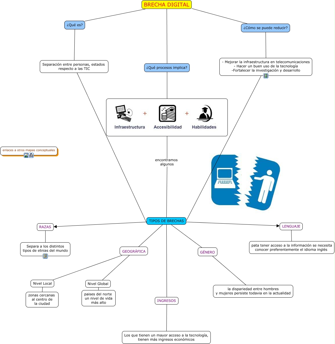 Este Cmap, tiene información relacionada con: NUEVO BRECHA DIGITAL, TIPOS DE BRECHAS RAZAS, GÉNERO la dispariedad entre hombres y mujeres persiste todavia en la actualidad, Nivel Global paises del norte un nivel de vida más alto, RAZAS Separa a los distintos tipos de etnias del mundo, TIPOS DE BRECHAS LENGUAJE, LENGUAJE pata tener acceso a la información se necesita conocer preferentemente el idioma inglés, GEOGRÁFICA Nivel Global, BRECHA DIGITAL ???? ¿Qué es?, Separación entre personas, estados respecto a las TIC TIPOS DE BRECHAS, BRECHA DIGITAL ¿Qué procesos implica?, encontramos algunos TIPOS DE BRECHAS, TIPOS DE BRECHAS INGRESOS, ¿Cómo se puede reducir? - Mejorar la infraestructura en telecomunicaciones - Hacer un buen uso de la tecnología -Fortalecer la investigación y desarrollo, GEOGRÁFICA Nivel Local, BRECHA DIGITAL ???? ¿Cómo se puede reducir?, Nivel Local zonas cercanas al centro de la ciudad, INGRESOS Los que tienen un mayor acceso a la tecnología, tienen más ingresos económicos, - Mejorar la infraestructura en telecomunicaciones - Hacer un buen uso de la tecnología -Fortalecer la investigación y desarrollo TIPOS DE BRECHAS, ¿Qué es? Separación entre personas, estados respecto a las TIC, ¿Qué procesos implica?