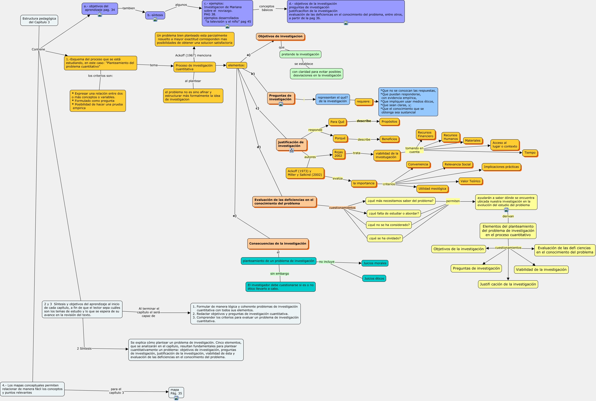 Este Cmap, tiene información relacionada con: Capitulo 3 presentacion, Elementos del planteamiento del problema de investigación en el proceso cuantitativo cuestionamientos Objetivos de la investigación, Objetivos de investigacion que pretende la investigación, Elementos del planteamiento del problema de investigación en el proceso cuantitativo cuestionamientos Preguntas de investigación, Elementos del planteamiento del problema de investigación en el proceso cuantitativo cuestionamientos Evaluación de las defi ciencias en el conocimiento del problema, la importancia criterios Utilidad meológica, Proceso de investigación cuantitativa Ackoff (1967) menciona Un problema bien planteado esta parcialmente resuelto a mayor exactitud corresponden mas posibilidades de obtener una solucion satisfactoria, 1.-Esquema del proceso que se está estudiando, en este caso: "Planteamiento del problema cuantitativo" los criterios son: * Expresar una relación entre dos o más conceptos o variables. * Formulado como pregunta * Posibilidad de hacer una prueba empirica, ¿qué más necesitamos saber del problema? permiten ¿qué se ha olvidado?, viabilidad de la investugación tomando en cuenta Acceso al lugar o contexto, viabilidad de la investugación tomando en cuenta Materiales, Elementos del planteamiento del problema de investigación en el proceso cuantitativo cuestionamientos Viabilidad de la investigación, Estructura pedagógica del Capítulo 3 Contiene a.- objetivos del aprendizaje pag. 34, justificación de investigación responde Porqué, 2 y 3 Síntesis y objetivos del aprendizaje al inicio de cada capítulo, a fin de que el lector sepa cuáles son los temas de estudio y lo que se espera de su avance en la revisión del texto. 2 Síntesis Se explica cómo plantear un problema de investigación. Cinco elementos, que se analizarán en el capítulo, resultan fundamentales para plantear cuantitativamente un problema: objetivos de investigación, preguntas de investigación, justificación de la investigación, viabilidad de ésta y evaluación de las deficiencias en el conocimiento del problema., planteamiento de un problema de investigación no incluye Juicios éticos, viabilidad de la investugación tomando en cuenta Recursos Humanos, c.- ejemplos: Investigacion de Mariana sobre el noviazgo. PAG 38. ejemplos desarrollados "la televisión y el niño" pag 45 conceptos básicos d.- objetivos de la investigación preguntas de investigación justificaciñon de la investigación evaluación de las deficienicas en el conocimiento del problema, entre otros, a partir de la pag 36., Porqué describe Beneficios, planteamiento de un problema de investigación sin embargo El investigador debe cuestionarse si es o no ético llevarlo a cabo., la importancia criterios Valor Teórico