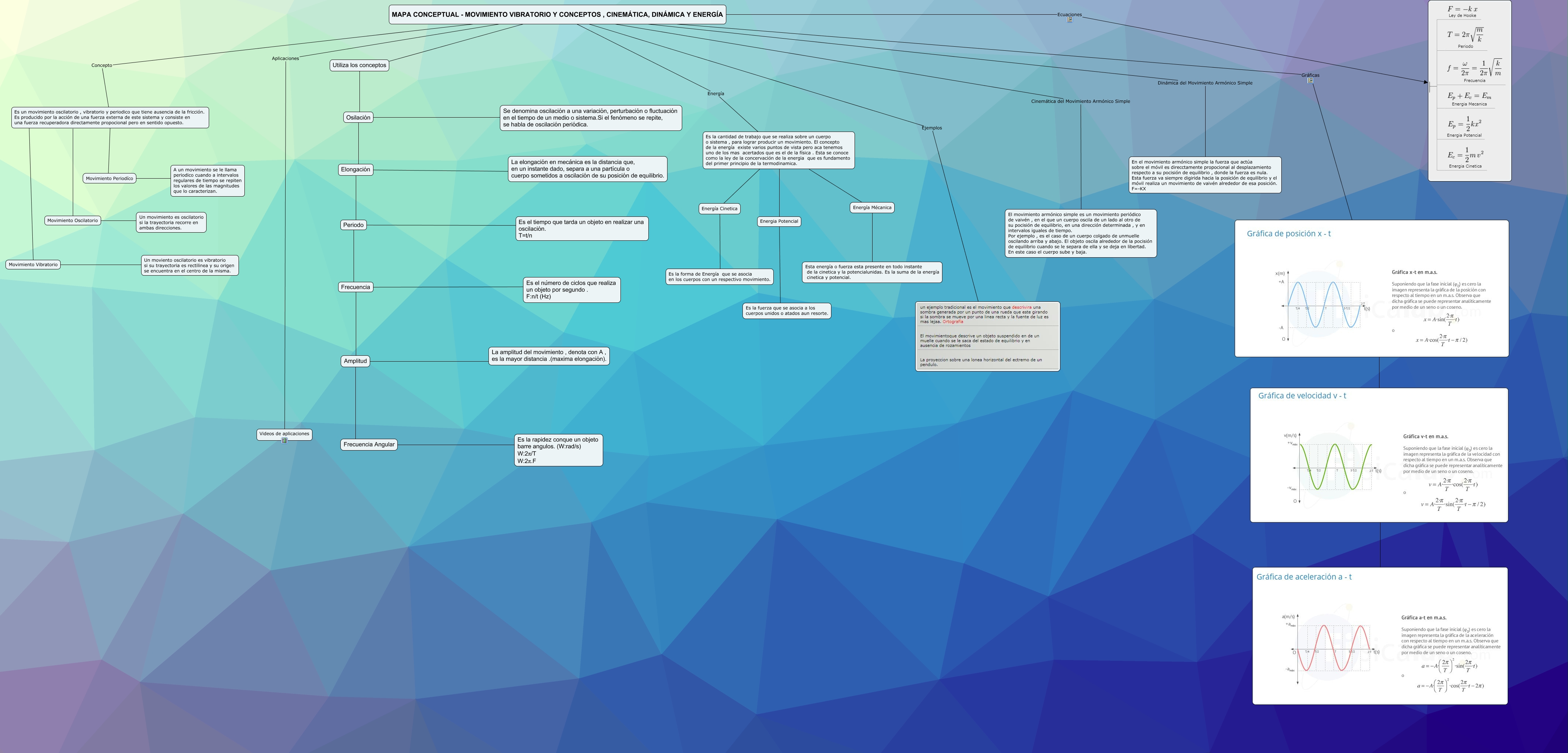 Este Cmap, tiene información relacionada con: Mapa conceptual - Movimiento vibratorio y conceptos, Cinemática, Dinámica y Energía, Periodo ???? Frecuencia, Elongación ???? La elongación en mecánica es la distancia que, en un instante dado, separa a una partícula o cuerpo sometidos a oscilación de su posición de equilibrio., Movimiento Vibratorio ???? Un moviento oscilatorio es vibratorio si su trayectoria es rectilinea y su origen se encuentra en el centro de la misma., Frecuencia ???? Amplitud, MAPA CONCEPTUAL - MOVIMIENTO VIBRATORIO Y CONCEPTOS , CINEMÁTICA, DINÁMICA Y ENERGÍA Aplicaciones Videos de aplicaciones, Es un movimiento oscilatorio , vibratorio y periodico que tiene ausencia de la fricción. Es producido por la acción de una fuerza externa de este sistema y consiste en una fuerza recuperadora directamente propocional pero en sentido opuesto. ???? Movimiento Periodíco, Utiliza los conceptos ???? Osilación, ????, Periodo ???? Es el tiempo que tarda un objeto en realizar una oscilación. T=t/n, MAPA CONCEPTUAL - MOVIMIENTO VIBRATORIO Y CONCEPTOS , CINEMÁTICA, DINÁMICA Y ENERGÍA Dinámica del Movimiento Armónico Simple En el movimiento armónico simple la fuerza que actúa sobre el móvil es direcctamente propocional al desplazamiento respecto a su pocisión de equilibrio , donde la fuerza es nula. Esta fuerza va siempre digirida hacia la posición de equilibrio y el móvil realiza un movimiento de vaivén alrededor de esa posición. F=-KX, MAPA CONCEPTUAL - MOVIMIENTO VIBRATORIO Y CONCEPTOS , CINEMÁTICA, DINÁMICA Y ENERGÍA Ejemplos, Elongación ???? Periodo, Movimiento Periodíco ???? A un movimiento se le llama periodico cuando a intervalos regulares de tiempo se repiten los valores de las magnitudes que lo caracterizan., Amplitud ???? La amplitud del movimiento , denota con A , es la mayor distancia .(maxima elongación)., Movimiento Oscilatorio ???? Es un movimiento oscilatorio , vibratorio y periodico que tiene ausencia de la fricción. Es producido por la acción de una fuerza externa de este sistema y consiste en una fuerza recuperadora directamente propocional pero en sentido opuesto., Energía Cinetica ???? Es la forma de Energía que se asocia en los cuerpos con un respectivo movimiento., Frecuencia ???? Es el número de ciclos que realiza un objeto por segundo . F:n/t (Hz), Es la cantidad de trabajo que se realiza sobre un cuerpo o sistema , para lograr producir un movimiento. El concepto de la energía existe varios puntos de vista pero aca tenemos uno de los mas acertados que es el de la física . Esta se conoce como la ley de la concervación de la energia que es fundamento del primer principio de la termodinamica. ???? Energía Mécanica, Energía Mécanica ???? Esta energía o fuerza esta presente en todo instante de la cinetica y la potencialunidas. Es la suma de la energía cinetica y potencial., Es la cantidad de trabajo que se realiza sobre un cuerpo o sistema , para lograr producir un movimiento. El concepto de la energía existe varios puntos de vista pero aca tenemos uno de los mas acertados que es el de la física . Esta se conoce como la ley de la concervación de la energia que es fundamento del primer principio de la termodinamica. ???? Energia Potencial