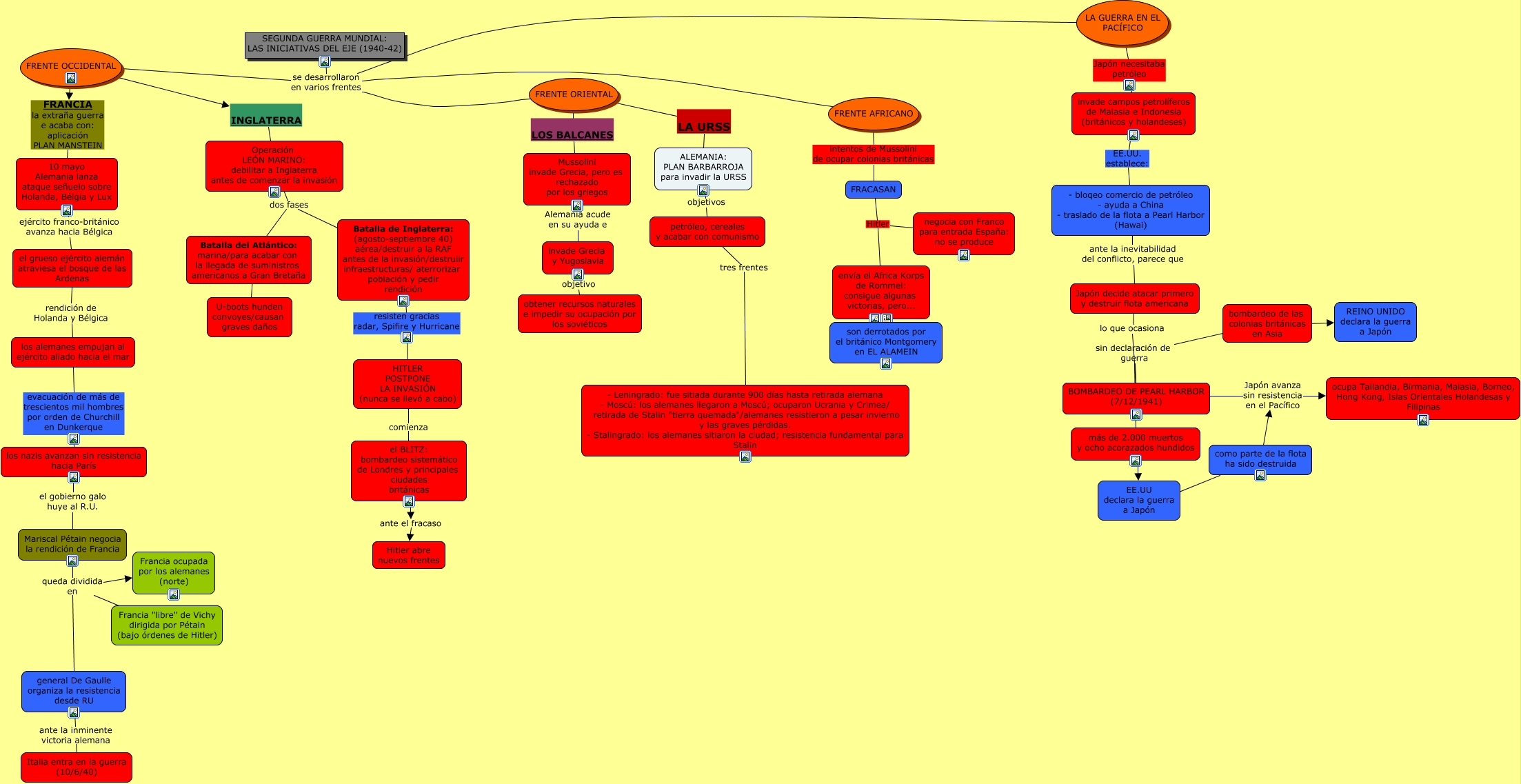 Este Cmap, tiene información relacionada con: IIGM-iniciativas del Eje, FRENTE ORIENTAL LA URSS ALEMANIA: PLAN BARBARROJA para invadir la URSS, general De Gaulle organiza la resistencia desde RU ante la inminente victoria alemana Italia entra en la guerra (10/6/40), Batalla del Atlántico: marina/para acabar con la llegada de suministros americanos a Gran Bretaña ???? U-boots hunden convoyes/causan graves daños, como parte de la flota ha sido destruida Japón avanza sin resistencia en el Pacífico ocupa Tailandia, Birmania, Malasia, Borneo, Hong Kong, Islas Orientales Holandesas y Filipinas, el grueso ejército alemán atraviesa el bosque de las Ardenas rendición de Holanda y Bélgica los alemanes empujan al ejército aliado hacia el mar, FRACASAN Hitler envía el Africa Korps de Rommel: consigue algunas victorias, pero..., bombardeo de las colonias británicas en Asia ???? REINO UNIDO declara la guerra a Japón, FRENTE AFRICANO intentos de Mussolini de ocupar colonias británicas FRACASAN, BOMBARDEO DE PEARL HARBOR (7/12/1941) sin declaración de guerra más de 2.000 muertos y ocho acorazados hundidos, Operación LEÓN MARINO: debilitar a Inglaterra antes de comenzar la invasión dos fases Batalla del Atlántico: marina/para acabar con la llegada de suministros americanos a Gran Bretaña, Japón decide atacar primero y destruir flota americana lo que ocasiona BOMBARDEO DE PEARL HARBOR (7/12/1941), invade campos petrolíferos de Malasia e Indonesia (británicos y holandeses) EE.UU. establece: - bloqeo comercio de petróleo - ayuda a China - traslado de la flota a Pearl Harbor (Hawai), Mariscal Pétain negocia la rendición de Francia queda dividida en Francia ocupada por los alemanes (norte), Mariscal Pétain negocia la rendición de Francia queda dividida en Francia "libre" de Vichy dirigida por Pétain (bajo órdenes de Hitler), ALEMANIA: PLAN BARBARROJA para invadir la URSS objetivos petróleo, cereales y acabar con comunismo, los alemanes empujan al ejército aliado hacia el mar evacuación de más de trescientos mil hombres por orden de Churchill en Dunkerque los nazis avanzan sin resistencia hacia París, SEGUNDA GUERRA MUNDIAL: LAS INICIATIVAS DEL EJE (1940-42) se desarrollaron en varios frentes FRENTE AFRICANO, Mussolini invade Grecia, pero es rechazado por los griegos Alemania acude en su ayuda e invade Grecia y Yugoslavia, el BLITZ: bombardeo sistemático de Londres y principales ciudades británicas ante el fracaso Hitler abre nuevos frentes, SEGUNDA GUERRA MUNDIAL: LAS INICIATIVAS DEL EJE (1940-42) se desarrollaron en varios frentes FRENTE ORIENTAL
