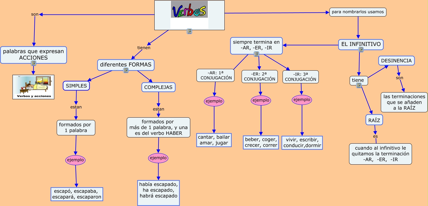 Este Cmap, tiene información relacionada con: EL VERBO LA RAIZ Y LA DESINENCIA, diferentes FORMAS ???? COMPLEJAS, formados por más de 1 palabra, y una es del verbo HABER ejemplo había escapado, ha escapado, habrá escapado, tienen diferentes FORMAS, COMPLEJAS estan formados por más de 1 palabra, y una es del verbo HABER, para nombrarlos usamos ???? EL INFINITIVO, siempre termina en -AR, -ER, -IR ???? -IR: 3ª CONJUGACIÓN, siempre termina en -AR, -ER, -IR ???? -AR: 1ª CONJUGACIÓN, -AR: 1ª CONJUGACIÓN ejemplo cantar, bailar amar, jugar, DESINENCIA son las terminaciones que se añaden a la RAÍZ, palabras que expresan ACCIONES ????, tiene ???? DESINENCIA, EL INFINITIVO ???? siempre termina en -AR, -ER, -IR, formados por 1 palabra ejemplo escapó, escapaba, escapará, escaparon, EL INFINITIVO ???? tiene, -IR: 3ª CONJUGACIÓN ejemplo vivir, escribir, conducir,dormir, siempre termina en -AR, -ER, -IR ???? -ER: 2ª CONJUGACIÓN, SIMPLES estan formados por 1 palabra, ???? para nombrarlos usamos, RAÍZ es ????, son palabras que expresan ACCIONES