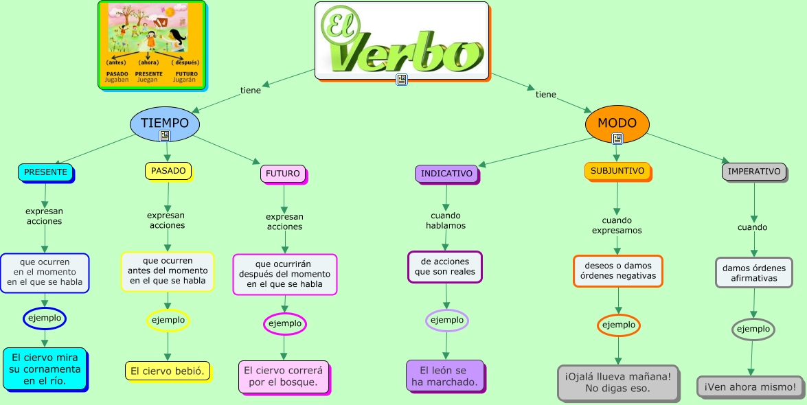 Este Cmap, tiene información relacionada con: EL VERBO TIEMPO Y MODO, FUTURO expresan acciones que ocurrirán después del momento en el que se habla, de acciones que son reales ejemplo El león se ha marchado., INDICATIVO cuando hablamos de acciones que son reales, MODO ???? SUBJUNTIVO, PRESENTE expresan acciones que ocurren en el momento en el que se habla, que ocurren en el momento en el que se habla ejemplo El ciervo mira su cornamenta en el río., deseos o damos órdenes negativas ejemplo ¡Ojalá llueva mañana! No digas eso., que ocurrirán después del momento en el que se habla ejemplo El ciervo correrá por el bosque., damos órdenes afirmativas ejemplo ¡Ven ahora mismo!, MODO ???? INDICATIVO, TIEMPO ???? PASADO, tiene MODO, tiene TIEMPO, TIEMPO ???? PRESENTE, que ocurren antes del momento en el que se habla ejemplo El ciervo bebió., MODO ???? IMPERATIVO, SUBJUNTIVO cuando expresamos deseos o damos órdenes negativas, PASADO expresan acciones que ocurren antes del momento en el que se habla, TIEMPO ???? FUTURO, IMPERATIVO cuando damos órdenes afirmativas