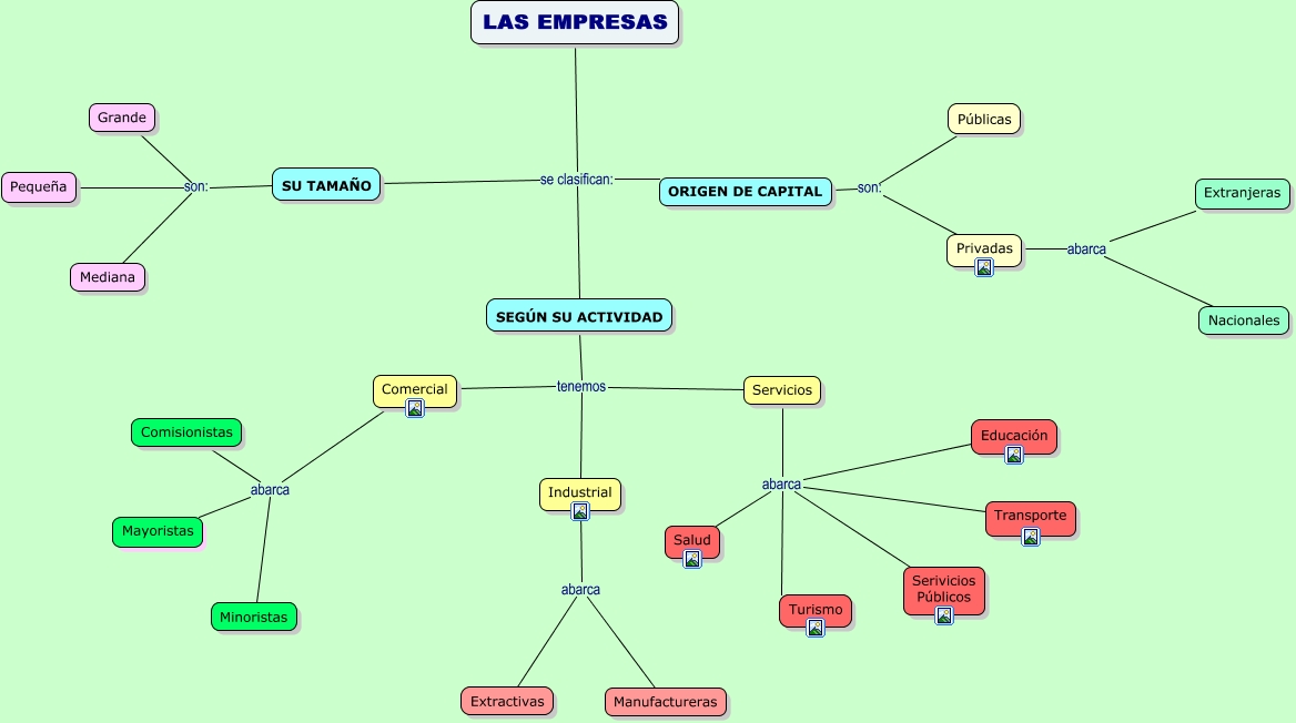 Este Cmap, tiene información relacionada con: CLASIFICACION DE EMPRESAS, Industrial abarca Extractivas, Comercial abarca Mayoristas, LAS EMPRESAS se clasifican: SEGÚN SU ACTIVIDAD, SEGÚN SU ACTIVIDAD tenemos Industrial, SEGÚN SU ACTIVIDAD tenemos Comercial, SEGÚN SU ACTIVIDAD tenemos Servicios, ORIGEN DE CAPITAL son: Públicas, ORIGEN DE CAPITAL son: Privadas, SU TAMAÑO son: Mediana, Servicios abarca Educación, LAS EMPRESAS se clasifican: ORIGEN DE CAPITAL, Privadas abarca Nacionales, Privadas abarca Extranjeras, Servicios abarca Serivicios Públicos, SU TAMAÑO son: Pequeña, Servicios abarca Salud, Servicios abarca Transporte, Industrial abarca Manufactureras, SU TAMAÑO son: Grande, LAS EMPRESAS se clasifican: SU TAMAÑO